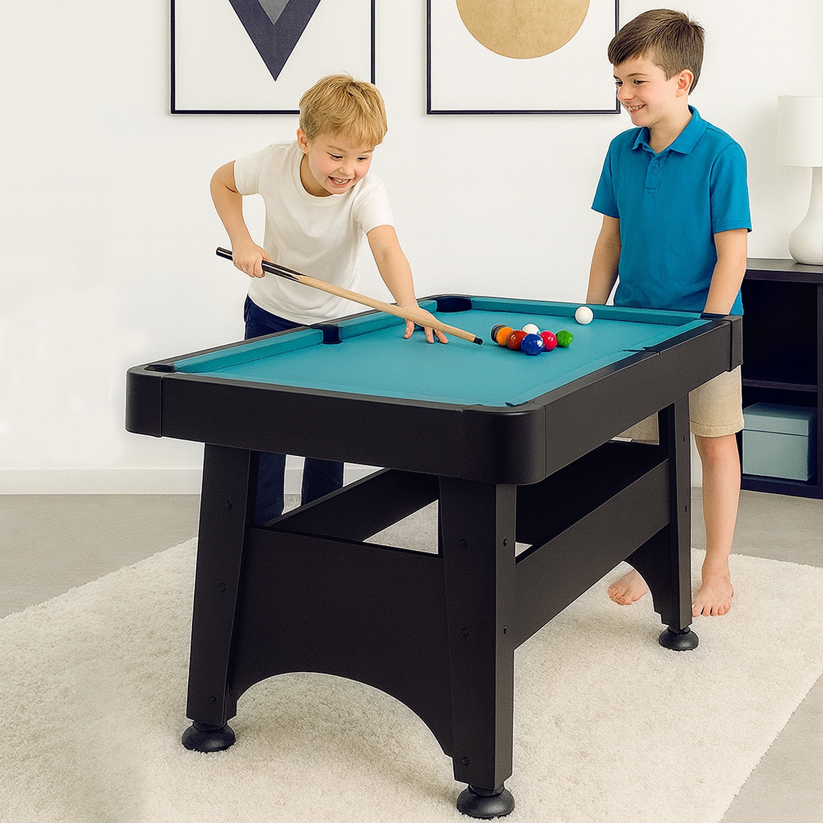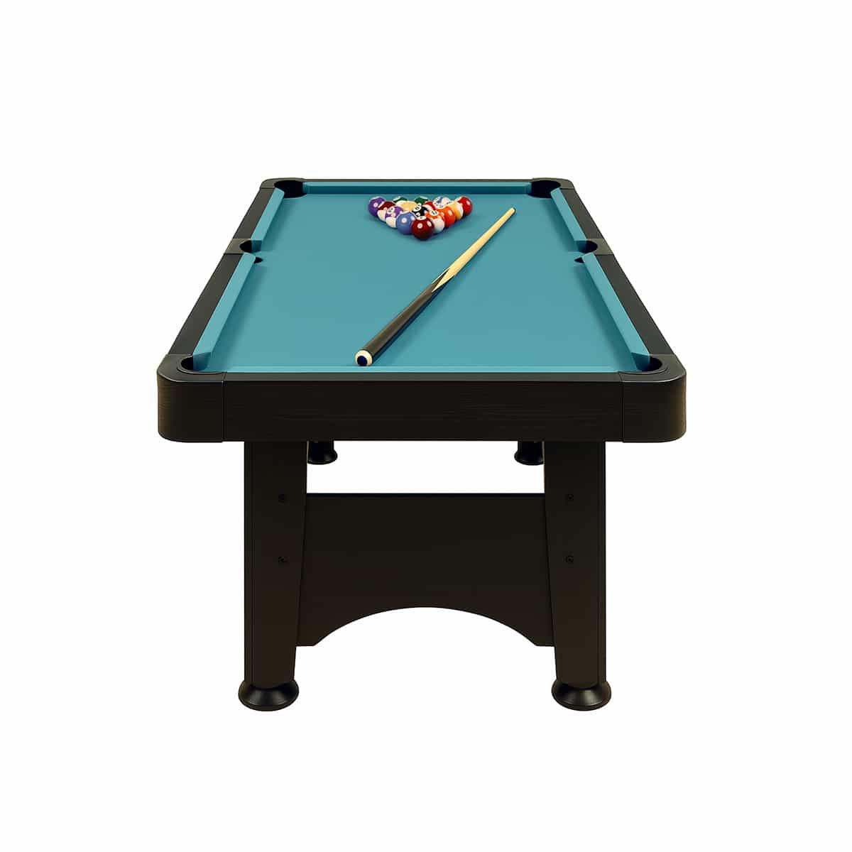 Das komplette Spielzubehör ist bereits im Lieferumfang enthalten: 1 Satz Kugeln (48 mm), zwei Spielqueues (120 cm), Aufstelldreieck sowie Billardkreide.