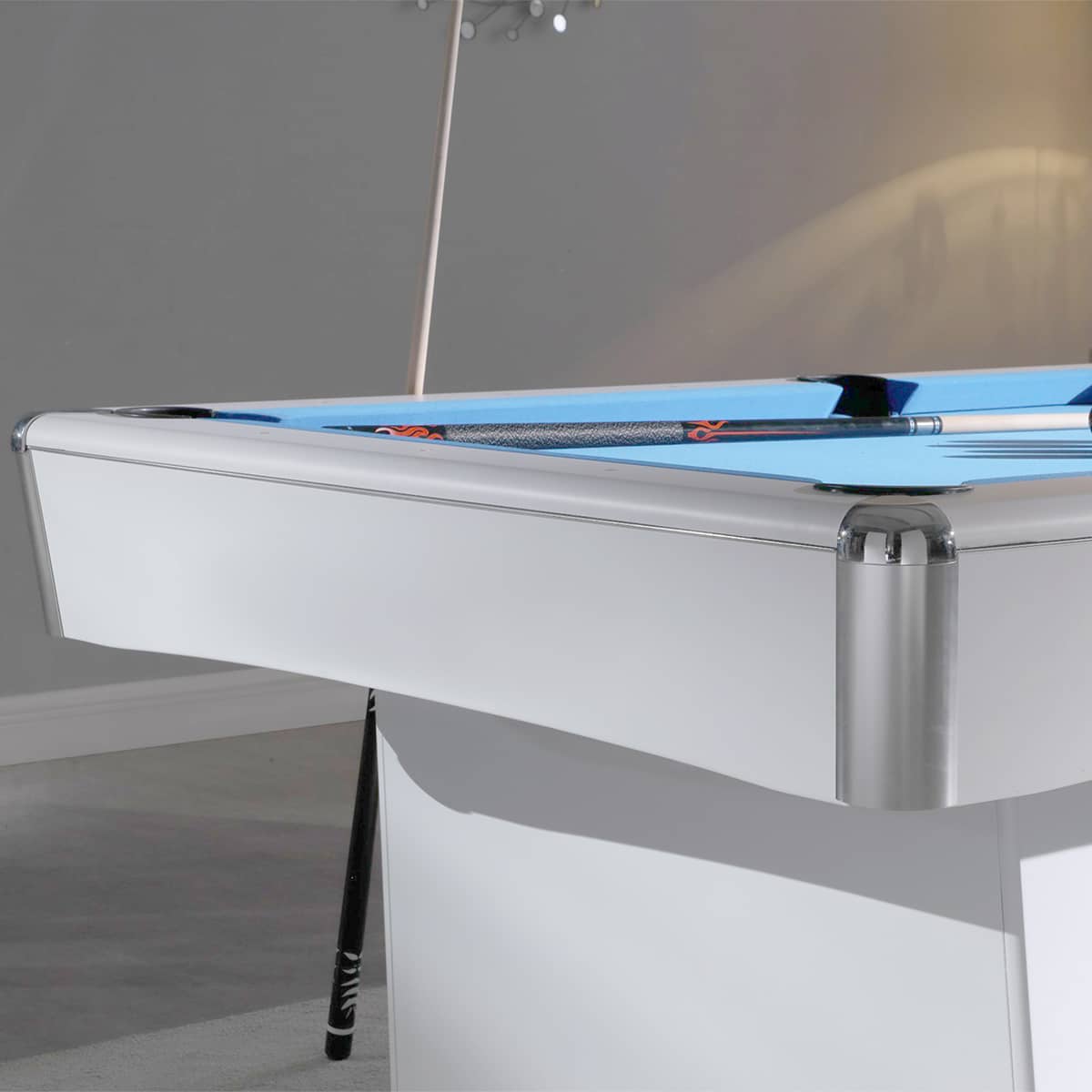 Optisch passend zu dem weißen Dekor, sind die verchromten Alu-Blendenecken an den Banden. Dadurch, dass der Granada eine 3-teilge Schieferplatte hat und auch alle anderen Bauteile zerlegt sind, lässt sich der Tisch auch in schwierig zugängliche Räumlichkeiten problemlos transportieren.