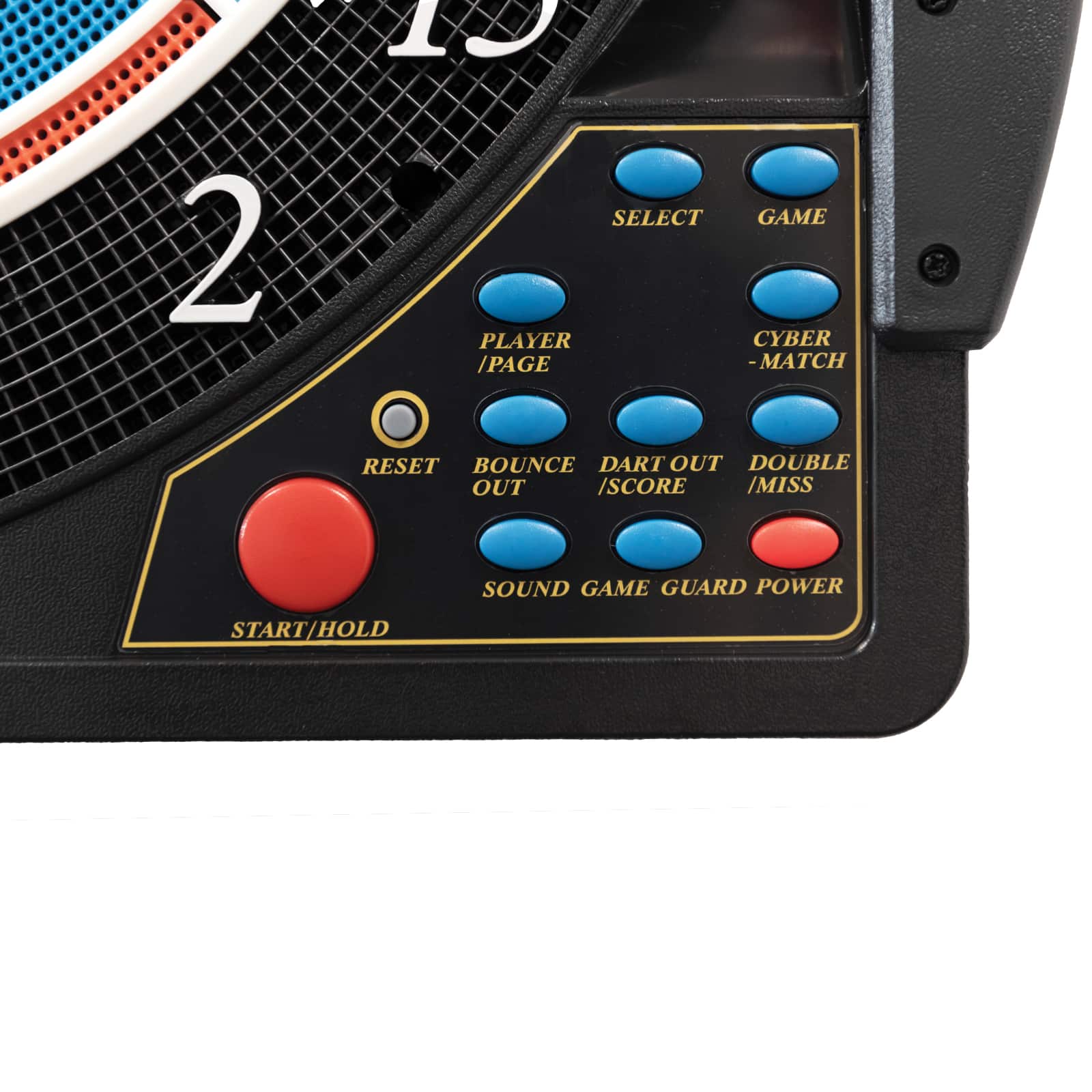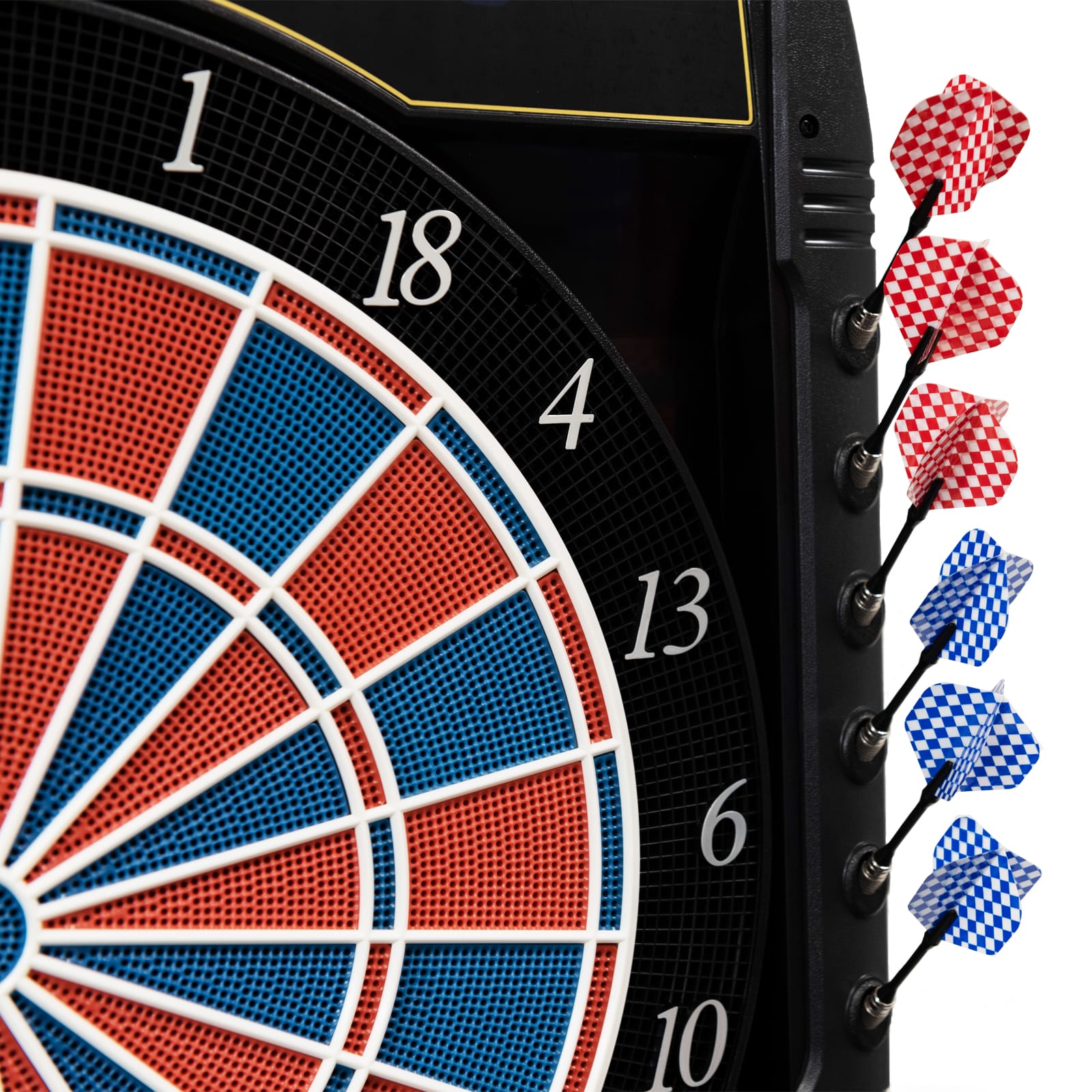 Weitere Highlights sind die elektronische Stimmenansage und Soundeffekte sowie der integrierte Darthalte am Rand des Boards, der Platz für bis zu 12 Darts bietet. Die Lautstärke ist 8-fach regulierbar. Ausschließlich geeignet für Softdarts bis maximal 18 g. Im Lieferumfang sind 12 Darts (ca. 15 g), Ersatzspitzen, Netzteil sowie Montagematerial enthalten.