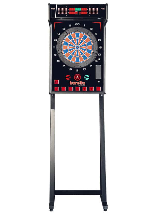 Professioneller Dartautomat mit Münzprüfer und Standfuß für höchste Ansprüche. Das hochwertig verarbeitete Gerät wird in der EU gefertigt und bietet die gängigsten Spiele wie 180, 301, 501, 701, 901, Cricket und Parcheesi mit den Optionen Double In, Double Out, Master Out, Team und Cut Throat. Bis zu 4 Spieler können sich gleichzeitig am E-Master duellieren. Der automatische Spielerwechsel, die integrierte Fehlwurferkennung und die optimale Ausleuchtung des Dartboards sorgen für höchsten Komfort beim Spielen.