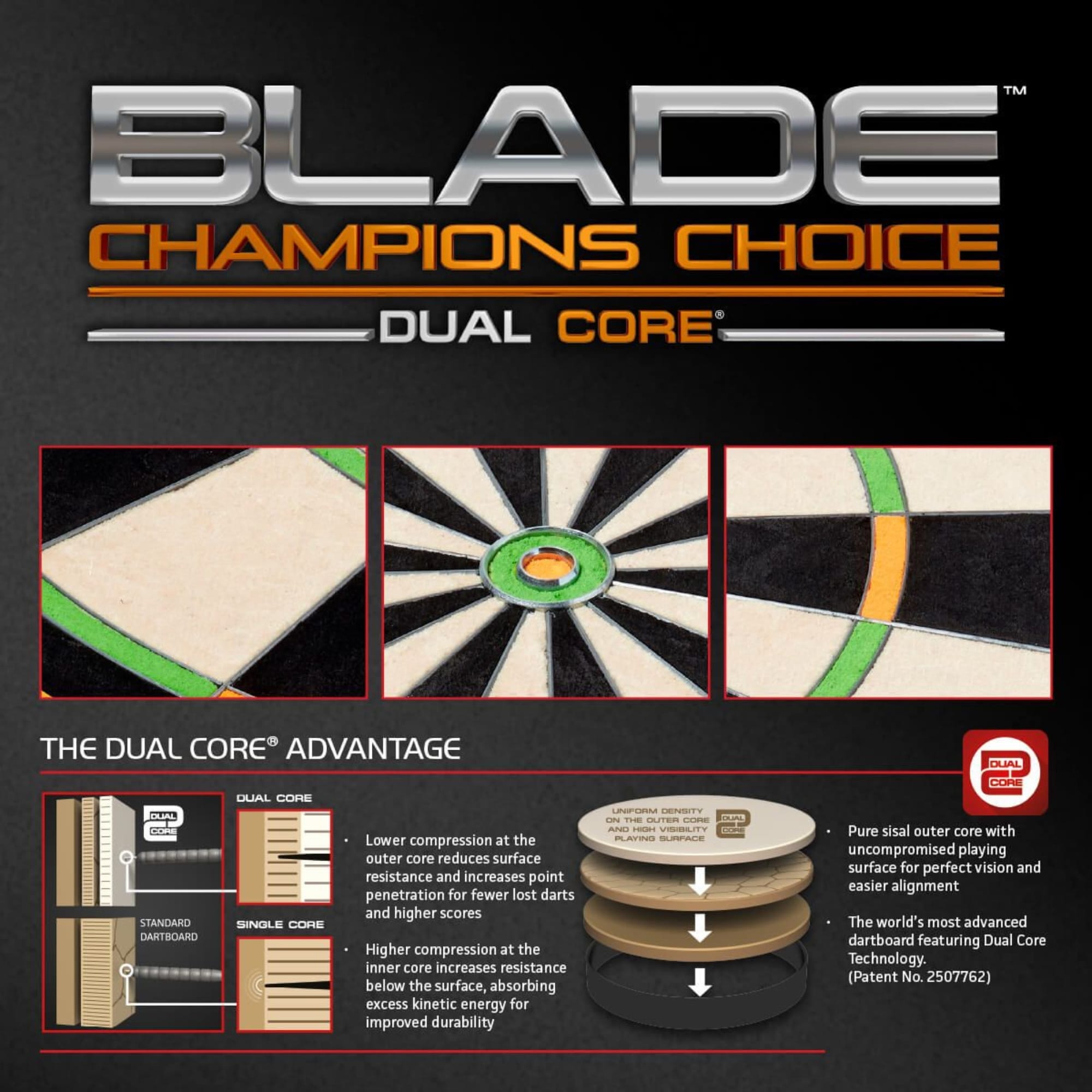 Beim Blade 6 Dual Core kommt die von Winmau patentierte Dual-Core Technologie zum Einsatz. Die zwei unterschiedlich stark gepressten Sisalschichten sorgen für eine nahtlose, gut sichtbare Spieloberfläche und für höhere Punktestände. Der innere Kern ist besonders dicht gepresst. Dadurch erhöht sich der Widerstand unterhalb der Oberfläche, wodurch überschüssige kinetische Energie absorbiert und die Haltbarkeit des Dartboards verbessert wird. Die äußere Sisalschicht ist weniger dicht gepresst. Dies sorgt für einen reduzierten Oberflächenwiderstand und damit für ein leichteres Eindringen der Pfeile mit geringer Abprallquote. Lieferung inklusive Check-out Tabelle und Rota-Lock Montageset, zur perfekten Ausrichtung des Boards an der Wand.
