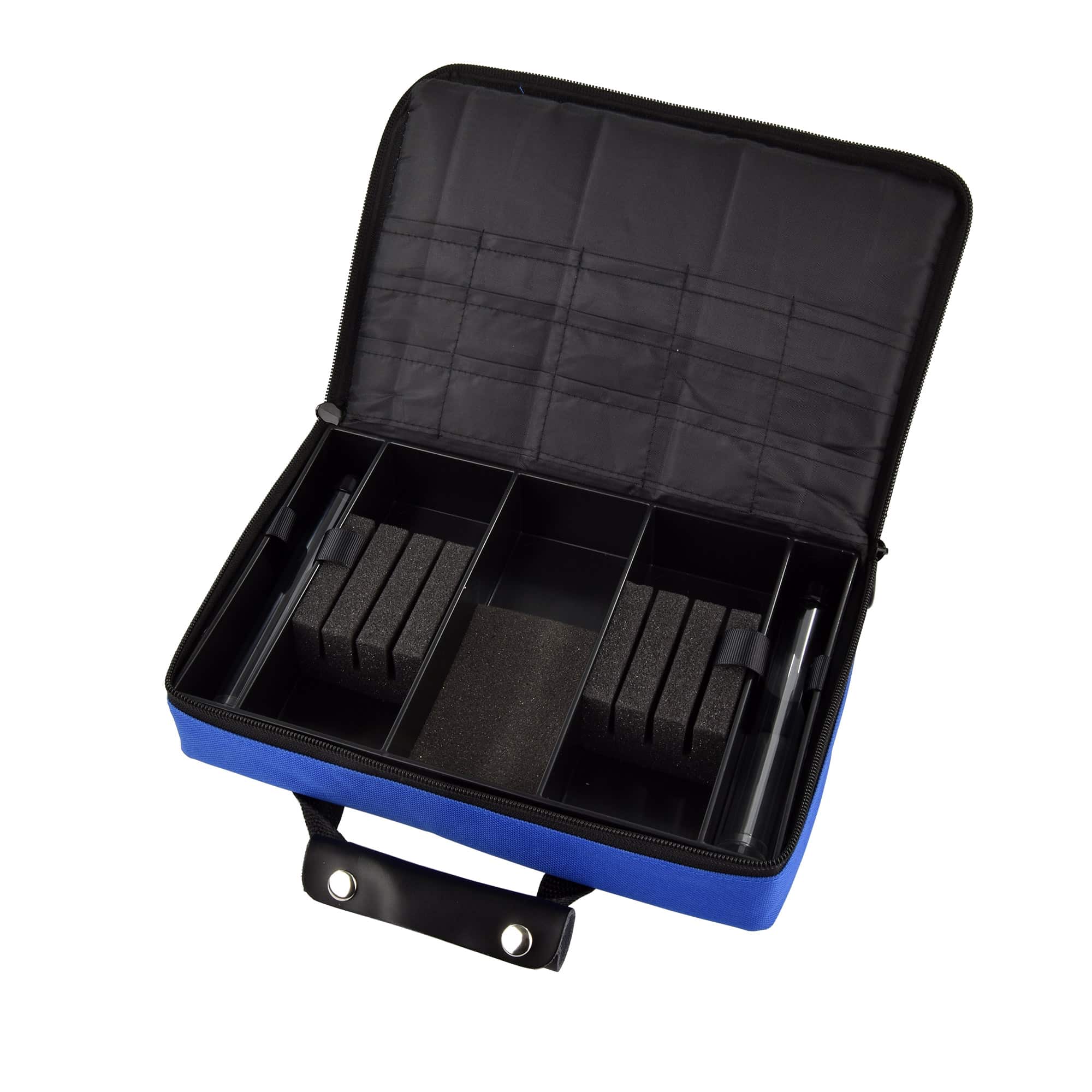 Große, praktisch konzipierte Tasche mit Schaumstoffeinteilungen für bis zu 3 Satz montierte Darts und vielen Fächern für weiteres Zubehör. Außen befindet sich auf der Profi-Tasche ein robuster Nylonriemen mit Tragegriff. Der Tragegriff ist aus PU-Leder, liegt äußerst angenehm in der Hand und ist absolut robust.