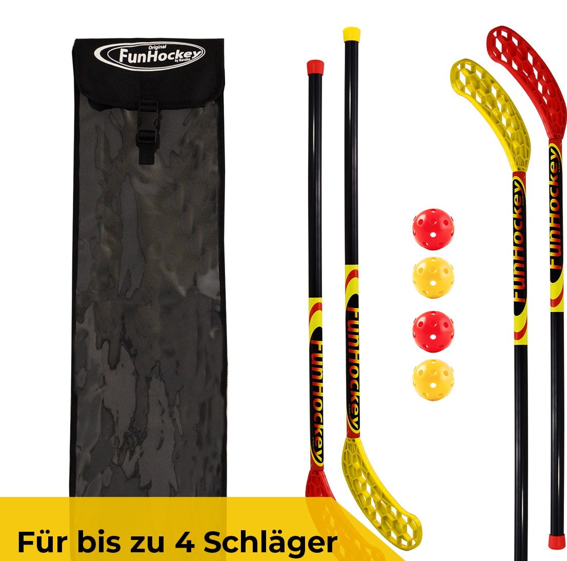Robuste Schlägertasche für FunHockey-Sets – Die Tasche bietet Platz für 4 Schläger (85 cm Länge) und 4 Spielbälle – ideal zur Aufbewahrung und zum einfachen Transport deines gesamten Sets.