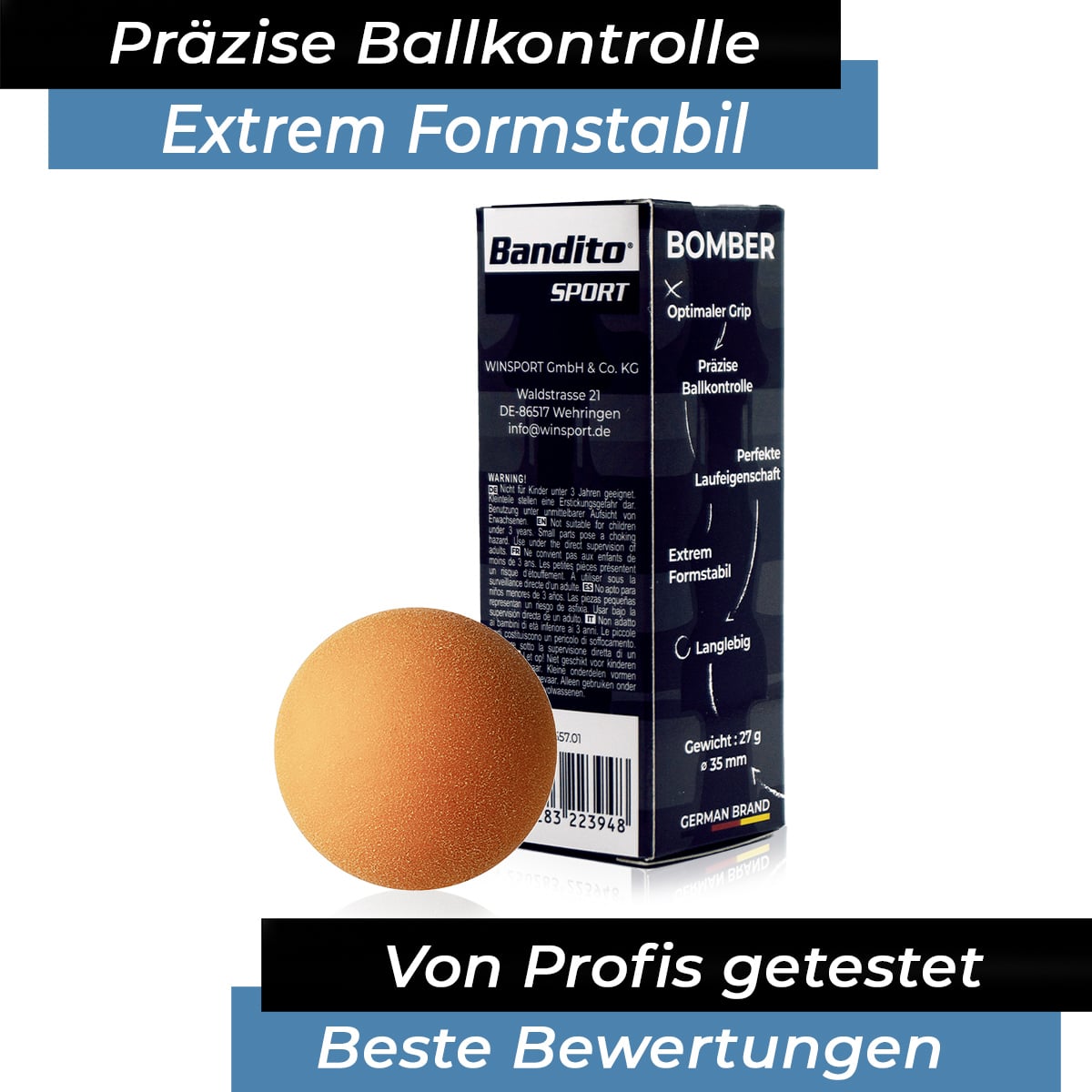 Der Bandito Spielball „Bomber“ erfüllt durch die „High Precision – Technologie“ die allerbesten Voraussetzungen für Hobbyspieler, ambitionierte Spitzenspieler und Profis. Eine optimale Materialkomposition (u.a. Thermoplastisches Polyurethan) garantiert nahtlose Produkte und damit lässt sich dieser Qualitäts-Turnierball nahezu auf allen Tischen spielen. Jeder Robertson Ball unterliegt strengen Qualitätskontrollen. Das betrifft u. a. im Schwerpunkt die Gewichtskontrolle (Match-Weighted-Control) und garantiert, dass eine max. Abweichung nur unter 0.1 g liegt. Damit ist eine gleichbleibende Qualität dieses exzellenten Turnier-Spielballs gewährleistet. Das gleiche gilt für den 100 % präzisen Durchmesser und dem einzigartigen Gripp (aggressive Profilfinish), das in einem aufwändigen Spezialverfahren im Hause „Bandito“ hergestellt wird. Diese bestmögliche Oberflächenbeschaffenheit garantiert das professionelle Spiel und lässt nahezu alle Spieltechniken zu. Mit dieser Neuentwicklung werden TOP-Balleigenschaften gewährleistet: Extrem gute Griffigkeit Ideales Ballgefühl Präzise Laufeigenschaften Unübertroffene Genauigkeit außergewöhnliche Laufruhe – keine Ballnähte oder Spritzgussrückstände Höheres Eigengewicht - dadurch geringer Rollwiderstand Komprimiertes (Reduziertes) Sprungverhalten Lange Lebensdauer Perfekte Farbauswahl – optimal für sehr komplexe und schnelle Aufnahmen- die Ballfarben heben sich exzellent von dem jeweiligen Spieluntergrund ab.