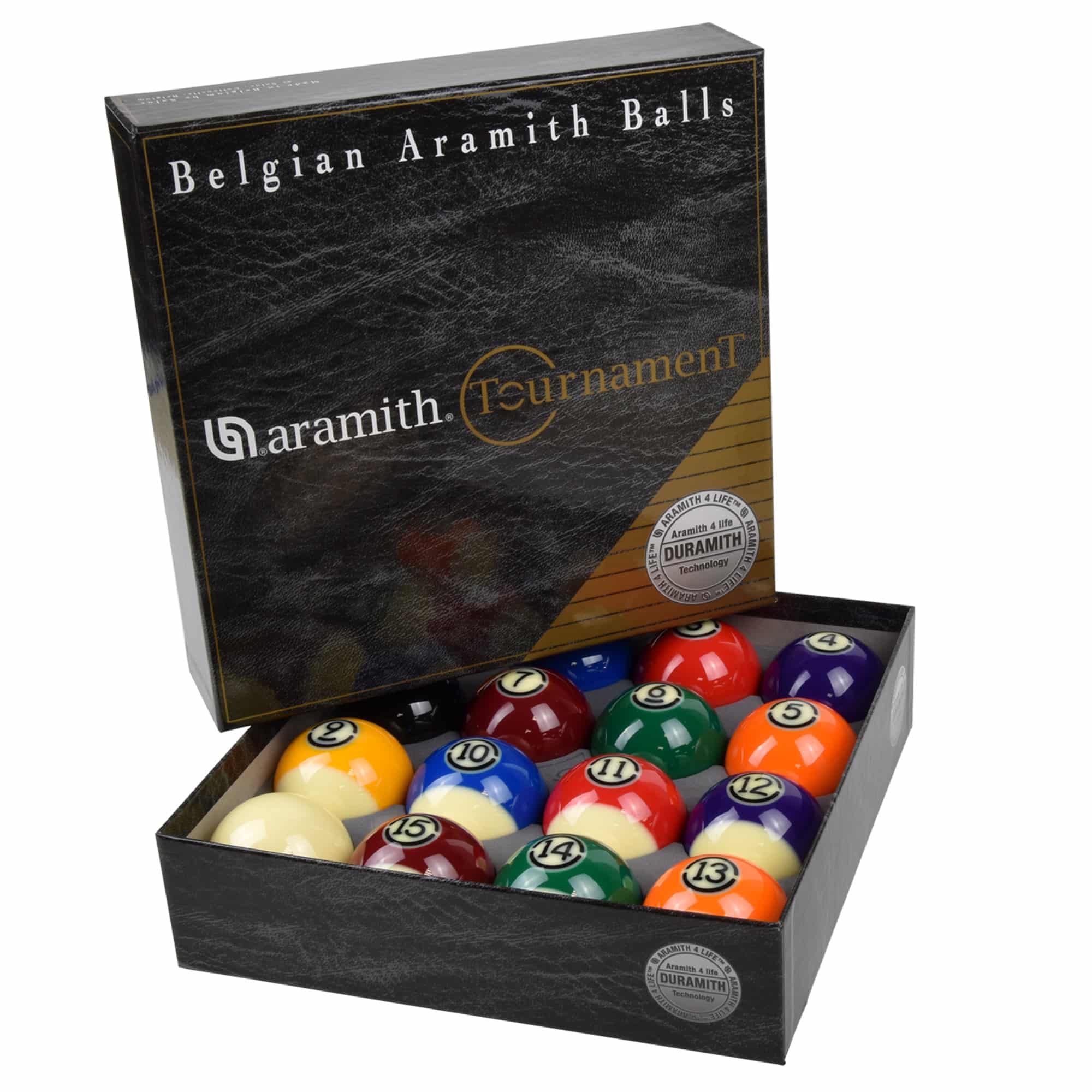 Die Aramith Tournament Kugeln sind die besten Kugeln aus dem Hause Saluc. Die Kugeln verfügen über die neueste Duramith™-Technologie und setzen neue Maßstäbe in Qualität und Langlebigkeit. Durch die hochentwickelte molekulare Struktur wird die Langlebigkeit der Bälle drastisch erhöht und gleichzeitig der Verschleiß des Billardtuchs auf ein Minimum reduziert. Die Materialzusammensetzung der Tournament Kugeln ermöglicht eine achtmal längere Lebensdauer gegenüber Kugeln aus Polyester- und oder phenolartigen Harzen. Im Wohnbereich können die Tournament Kugeln problemlos bis zu 40 Jahre verwendet werden. Die Aramith Tournament Kugeln sind die logische Wahl sowohl für den Handel als auch für den Spieler. Die Kugeln sind auch als TV-Satz verfügbar.