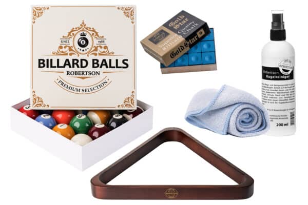 Das Kugelset Robertson erfüllte alle Qualitätsansprüche. Die professionell und aufwendig gefertigten Billardkugeln bestehen aus einer hochwertigen Kunststoffmischung, haben ein exzellentes Laufverhalten und einen perfekten Bandenanschlag. (Ø 57,2 mm & 6uz.) Alle Komponenten sind auf Qualität und Sicherheit durch die SGS geprüft. Außerdem haben die Kugeln einen auffällig intensiven Farb- und Glanzeffekt. Neben der mineralisierten Laminierung, die für langanhaltenden Glanz und UV-Beständigkeit der Kugeln sorgt, ist im Set der Kugelreiniger Robertson mit Mikrofasertuch (200 ml) enthalten. Dieser sorgt für einen zusätzlich Glanzeffekt, beseitigt Kreidestaub und sonstige Verschmutzungen. Passend dazu eine Robertson-Triangel (Mahagoni) aus erlesenem Kautschukholz. Abgerundet wird das Set durch die besonders weiche und feinkörnige Gold Star Kreide (12 St.), die sich durch ihre lange Haftfähigkeit auszeichnet und dadurch nicht bei jedem Stoß nachgekreidet werden muss.