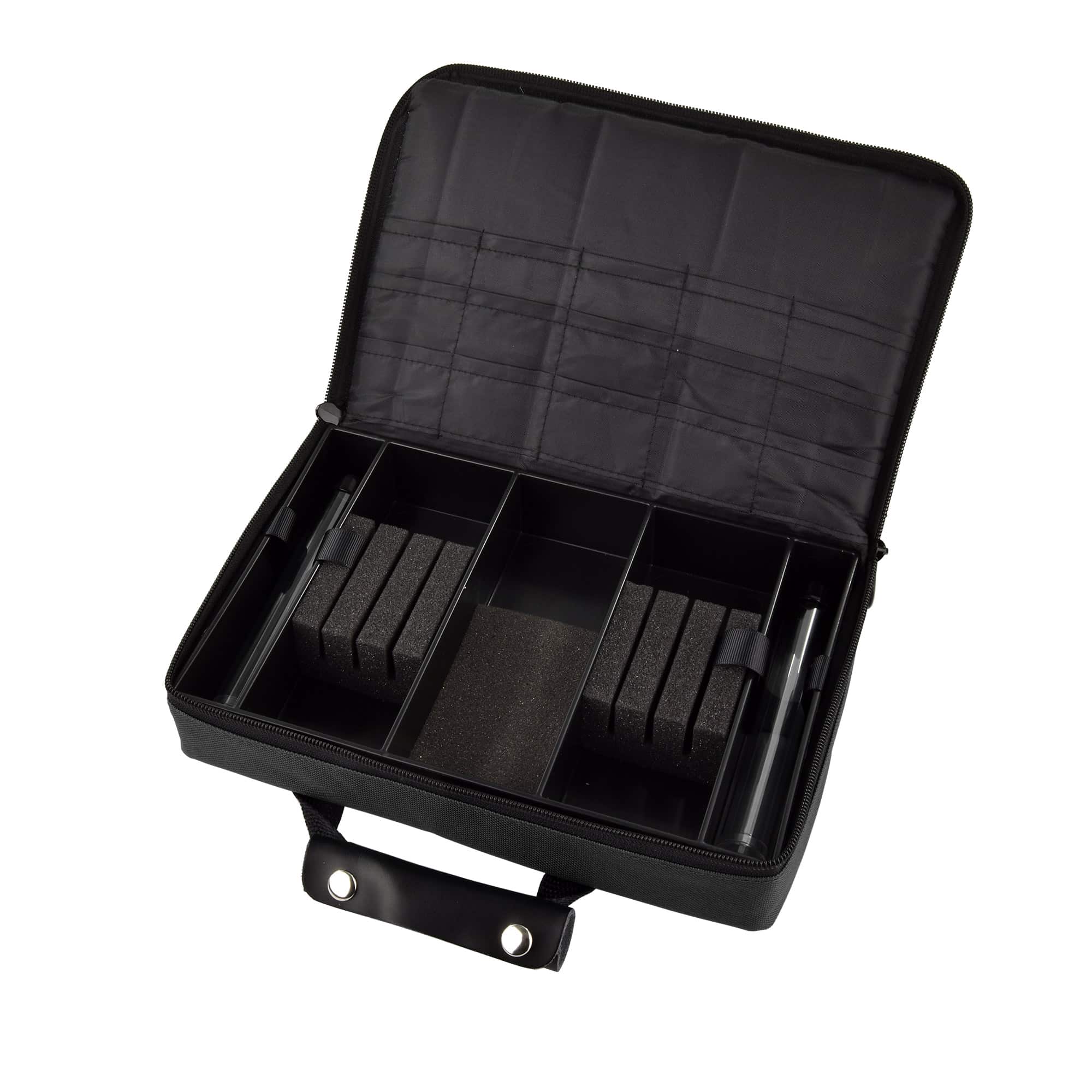 Große, praktisch konzipierte Tasche mit Schaumstoffeinteilungen für bis zu 3 Satz montierte Darts und vielen Fächern für weiteres Zubehör. Außen befindet sich auf der Profi-Tasche ein robuster Nylonriemen mit Tragegriff. Der Tragegriff ist aus PU-Leder, liegt äußerst angenehm in der Hand und ist absolut robust.