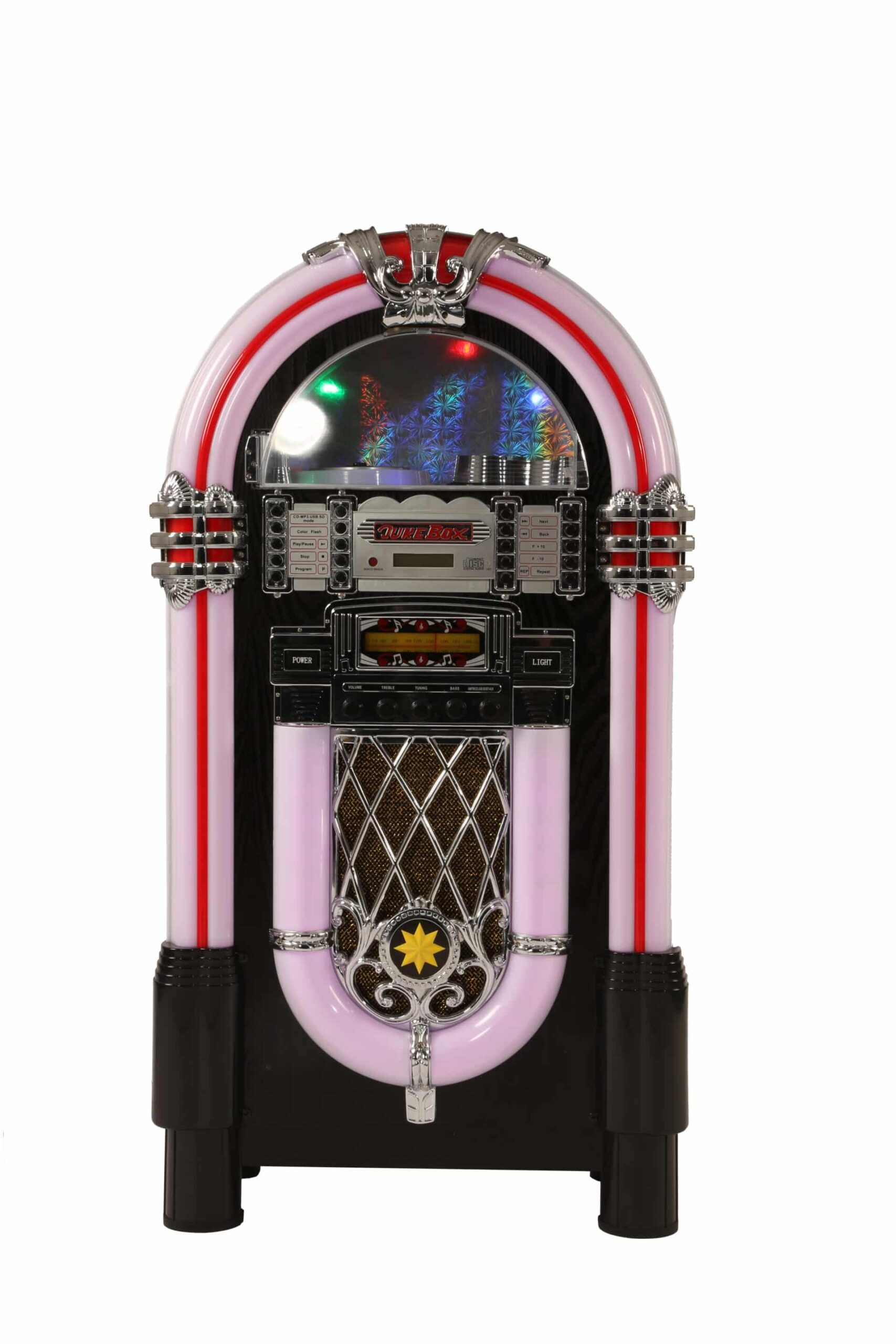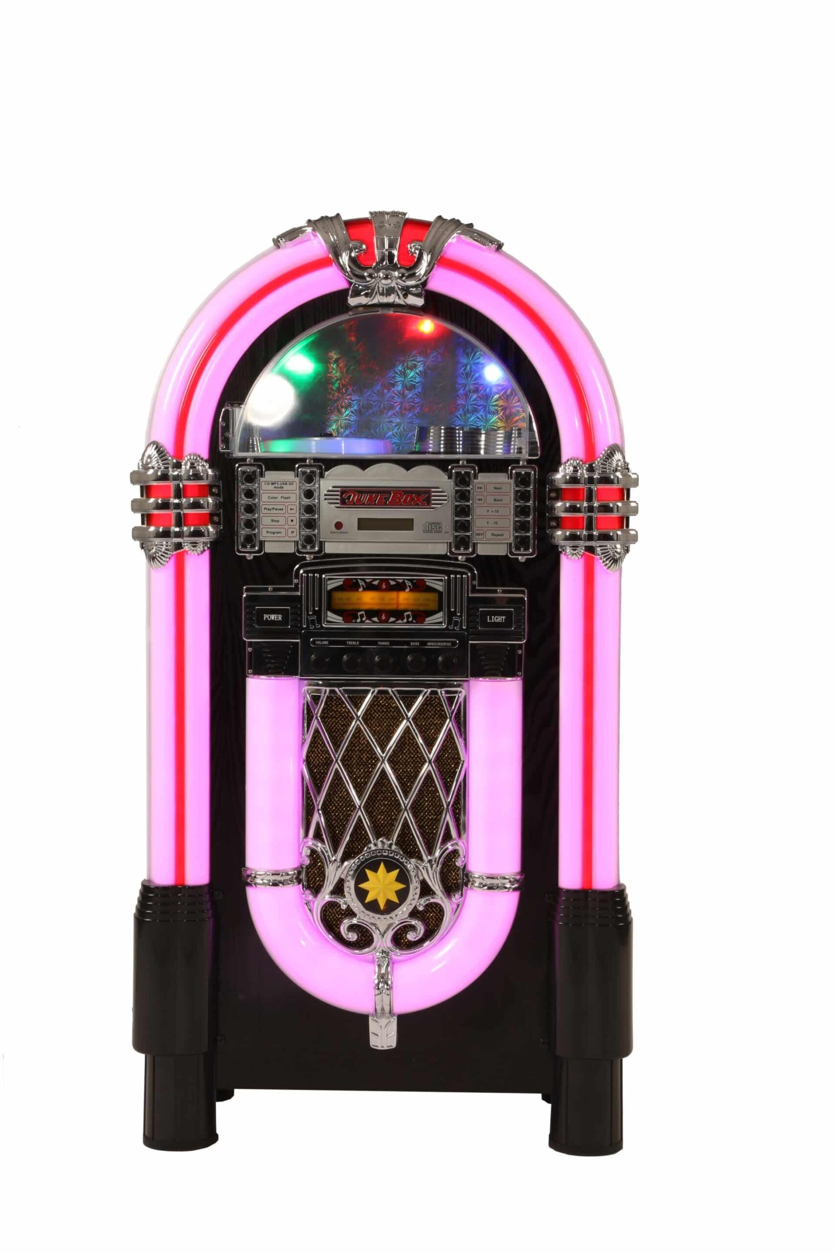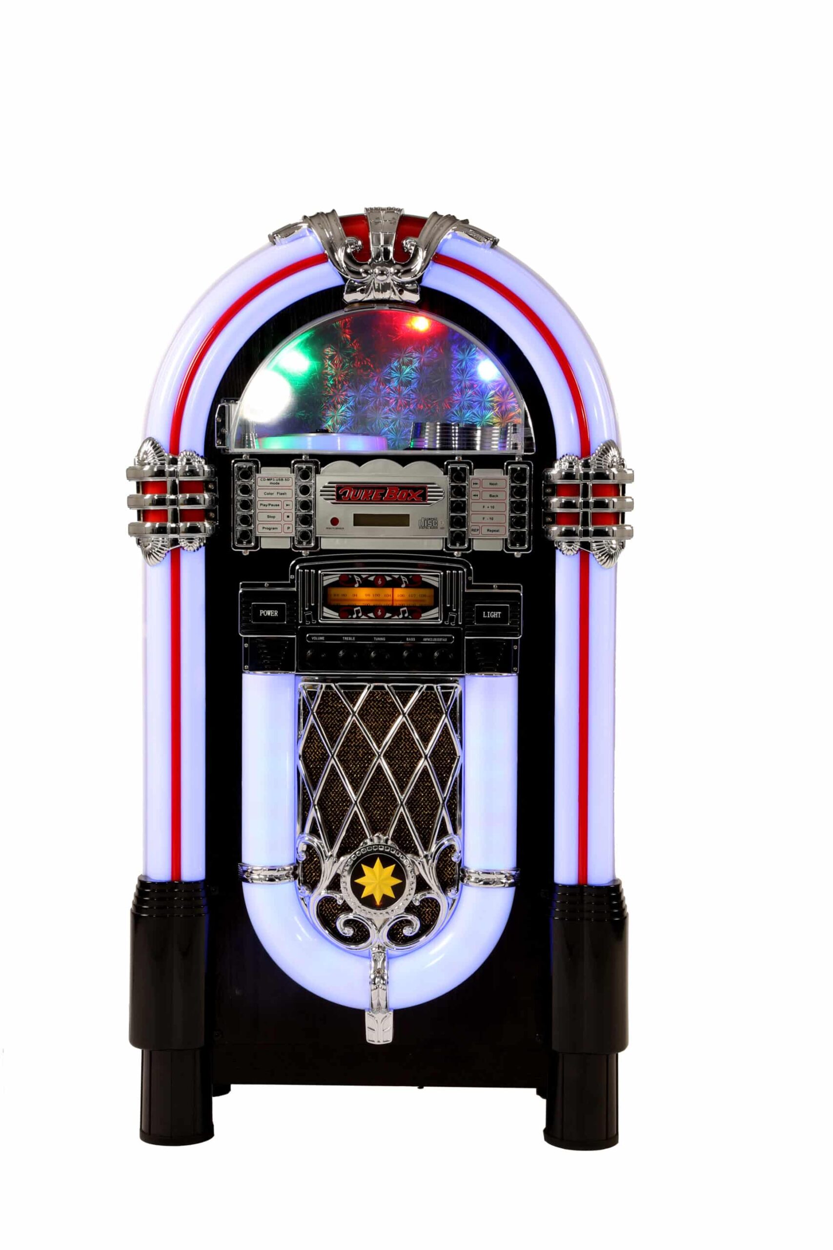 Eine tolle Musikbox, die jedem Liebhaber des traditionellen Designs, welches an die berühmten Wurlitzer-Musikboxen erinnert, das Herz höher schlagen lässt. Schon ihr Aussehen läßt jeden Betrachter an die Zeit denken, in der wirklich noch Musik gemacht wurde. Gleichgültig, ob die Musikbox im Restaurant, Partykeller oder Wohnzimmer erklingt, schon allein das Zusammenspiel der Farben dieses außergewöhnlichen Modells und seine extravaganten Details bieten Anlass zum Schwärmen.