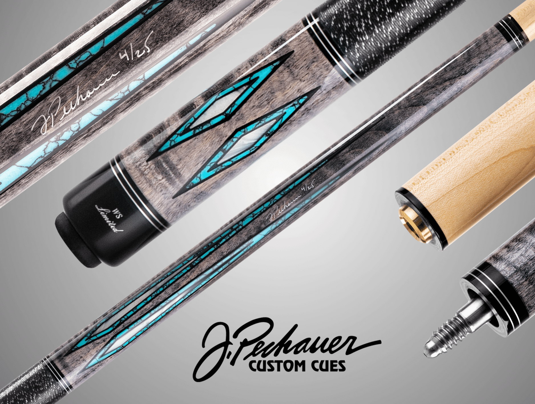 Selektiertes, abgelagertes kanadisches Ahornholz in smoke-grau gebeizt, mit Türkis und Abalone Muschel Design Einlagen. Mit passenden silbernen Zierringen vollendet sich das Unterteil in seiner Einzigartigkeit. Das Oberteil ist mittelhart, mit dem 12.75 mm Profi-Klebleder „Jade“ Medium ausgestattet. Das „Exklusiv“ für Winsport produzierte WS-Modell, ist auf 25 Stück limitiert und jedes ist von Joe Pechauer signiert.Optional kann man anstelle dem Standard Oberteil auch das härtere Mehrschicht-Oberteil „Low Deflection“ in 12, 75 oder 11.75 mm sowie auch das Rogue Carbon Oberteil in 3 Varianten wählen.Griffband: Aus traditionellem Irish Linen oder schwarzem Lizard Print Echtlederband