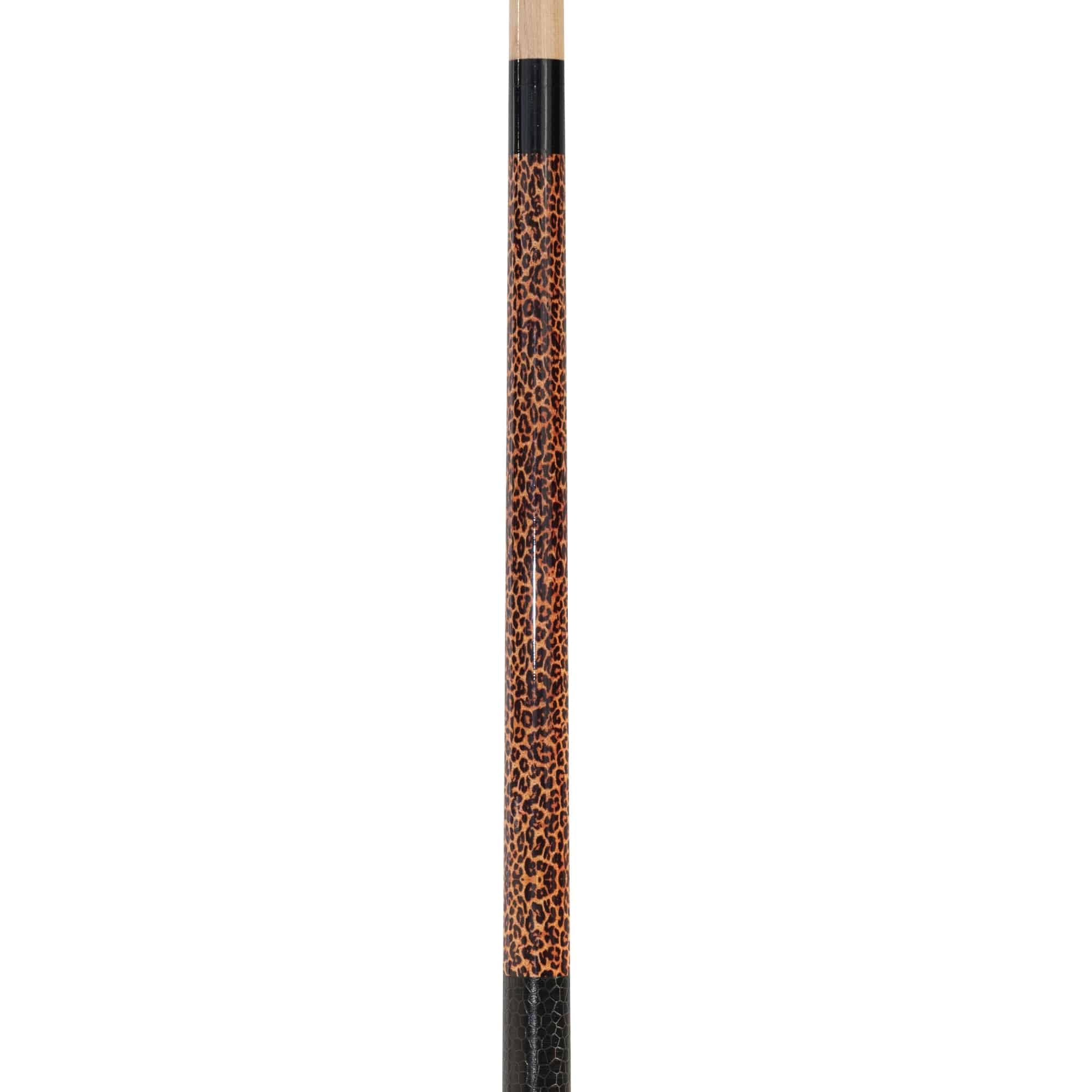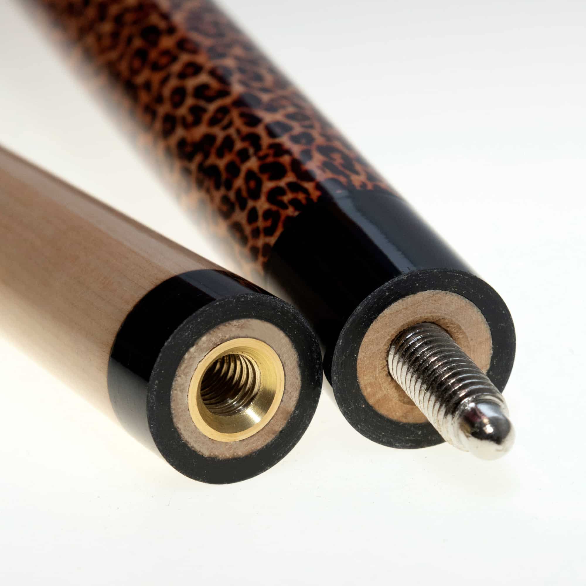Leopardenfell-Optik in edelster Ausführung macht dieses Modell „Leopardi“ zu einem absoluten Hingucker. Das passende schwarz genarbte Lederimitat im Griffbereich fühlt sich angenehm an und vollendet den Leo-Style perfekt. Das schwarzen Butcap ist mit dem Original Leopardi-Logo versehen. Der ebenfalls passende schwarze Joint verbindet das Oberteil mit einem präzisen 5/16 × 18 Stahl-Gewinde. Das hochwertige kanadische Ahornoberteil ist mit einem 12 mm Profi Klebeleder „Le Professional“ ausgestattet. Der Leopardi Queue besticht nicht nur durch seine originelle Optik, sondern auch durch seine tolle Spielqualität und das bei einem ausgezeichneten Preis/Leistungsverhältnis.