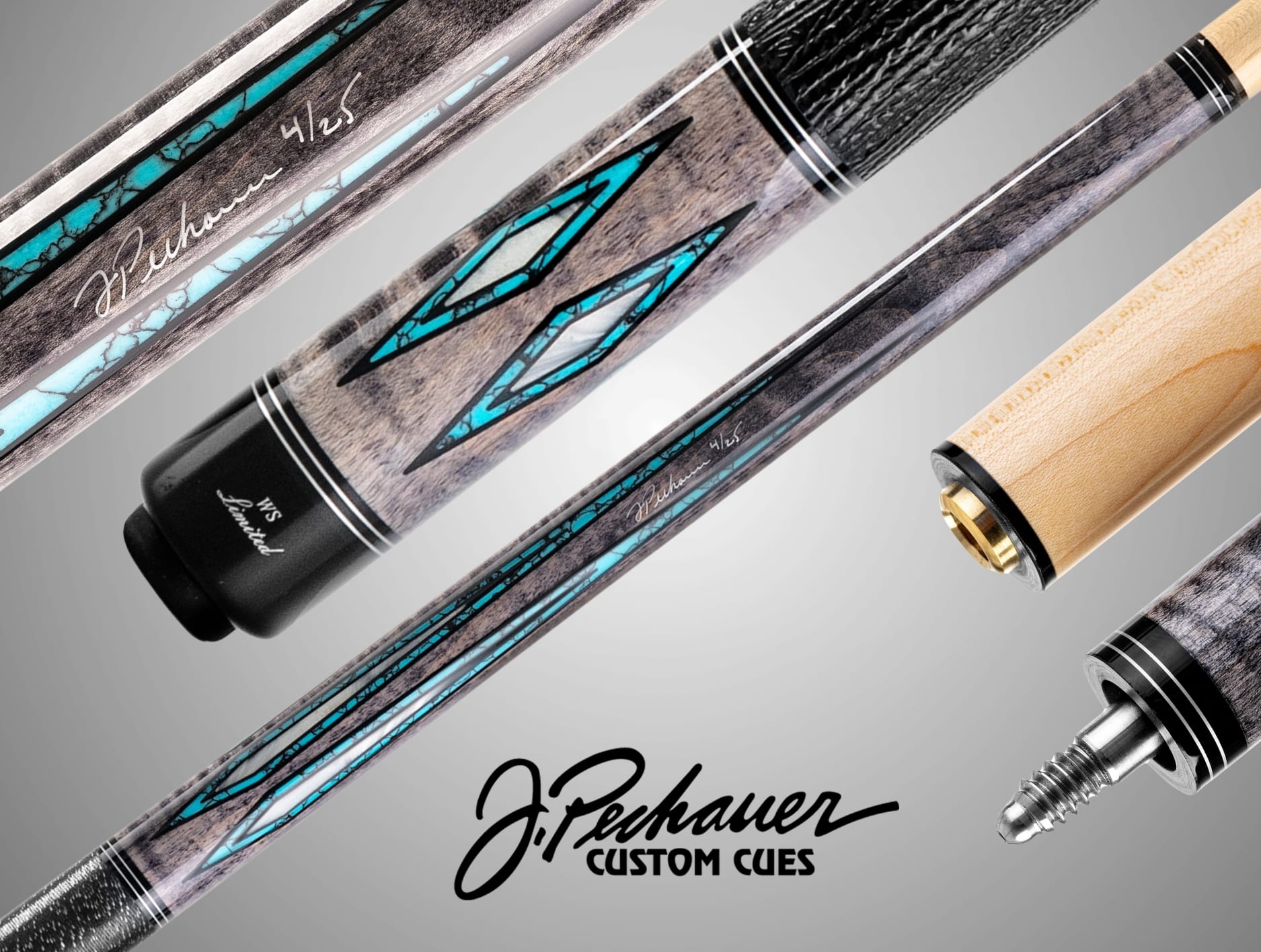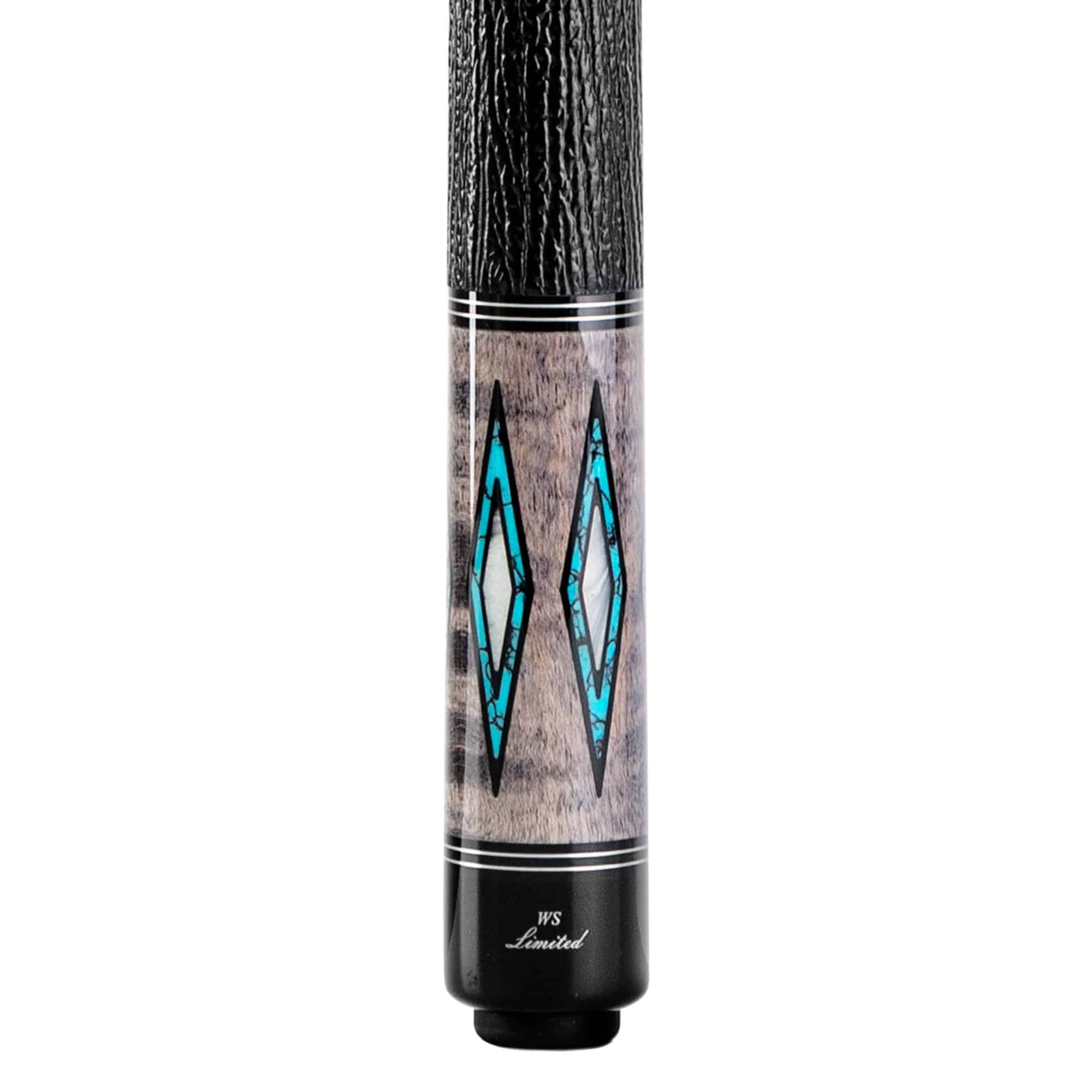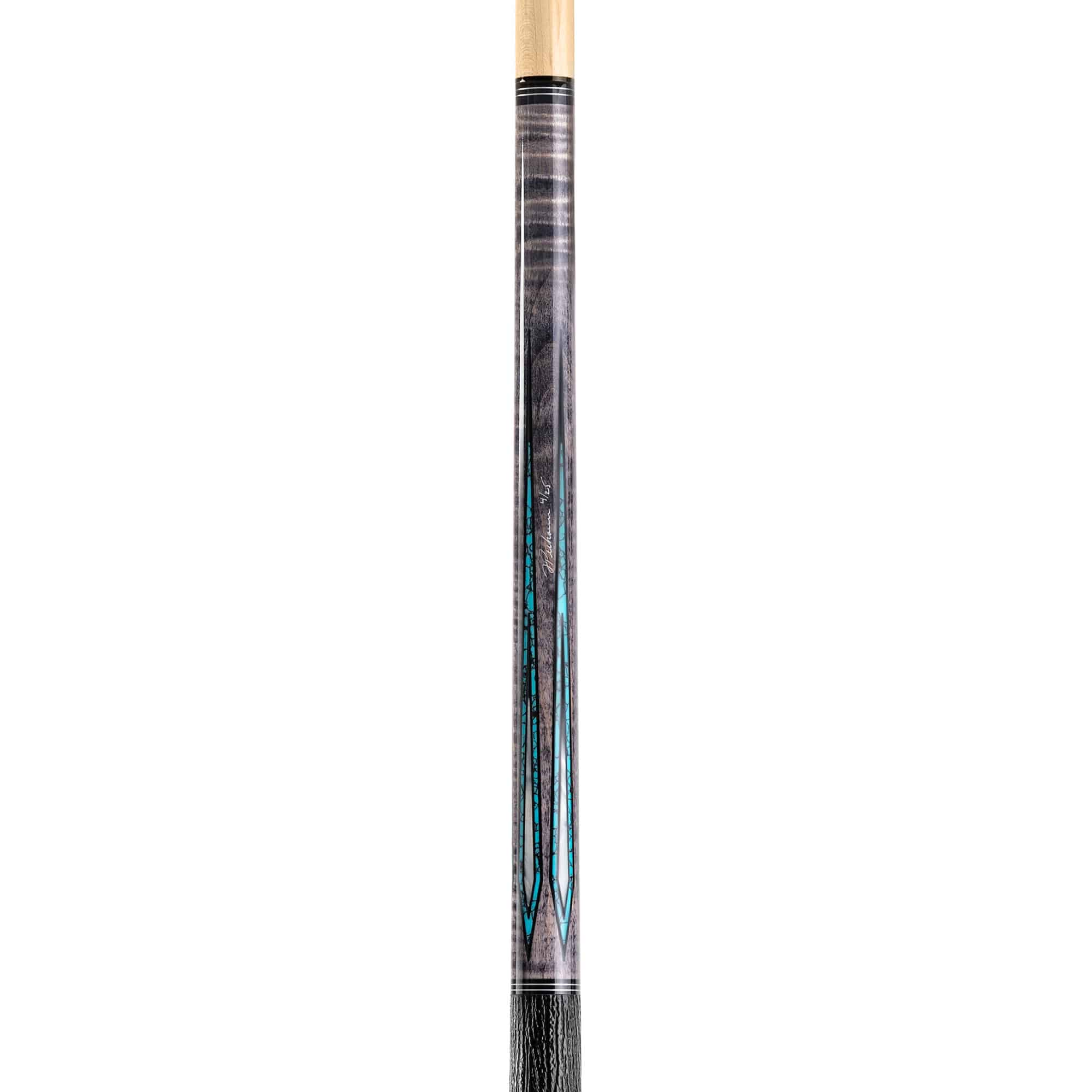 Selektiertes, abgelagertes kanadisches Ahornholz in smoke-grau gebeizt, mit Türkis und Abalone Muschel Design Einlagen. Mit passenden silbernen Zierringen vollendet sich das Unterteil in seiner Einzigartigkeit. Das Oberteil ist mittelhart, mit dem 12.75 mm Profi-Klebleder „Jade“ Medium ausgestattet. Das „Exklusiv“ für Winsport produzierte WS-Modell, ist auf 25 Stück limitiert und jedes ist von Joe Pechauer signiert.Optional kann man anstelle dem Standard Oberteil auch das härtere Mehrschicht-Oberteil „Low Deflection“ in 12, 75 oder 11.75 mm sowie auch das Rogue Carbon Oberteil in 3 Varianten wählen.Griffband: Aus traditionellem Irish Linen oder schwarzem Lizard Print Echtlederband