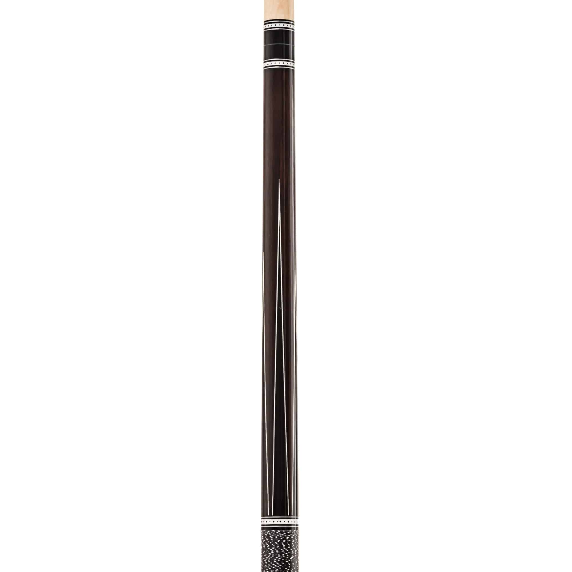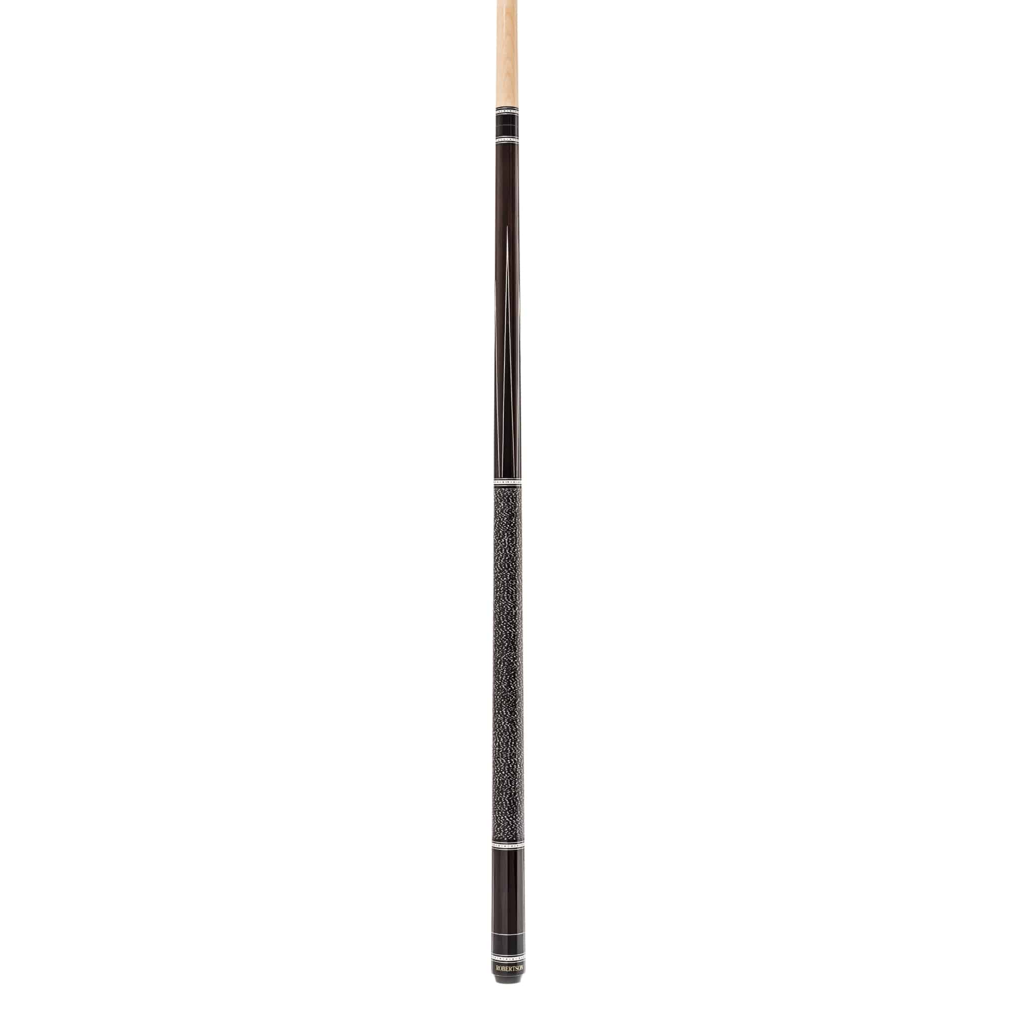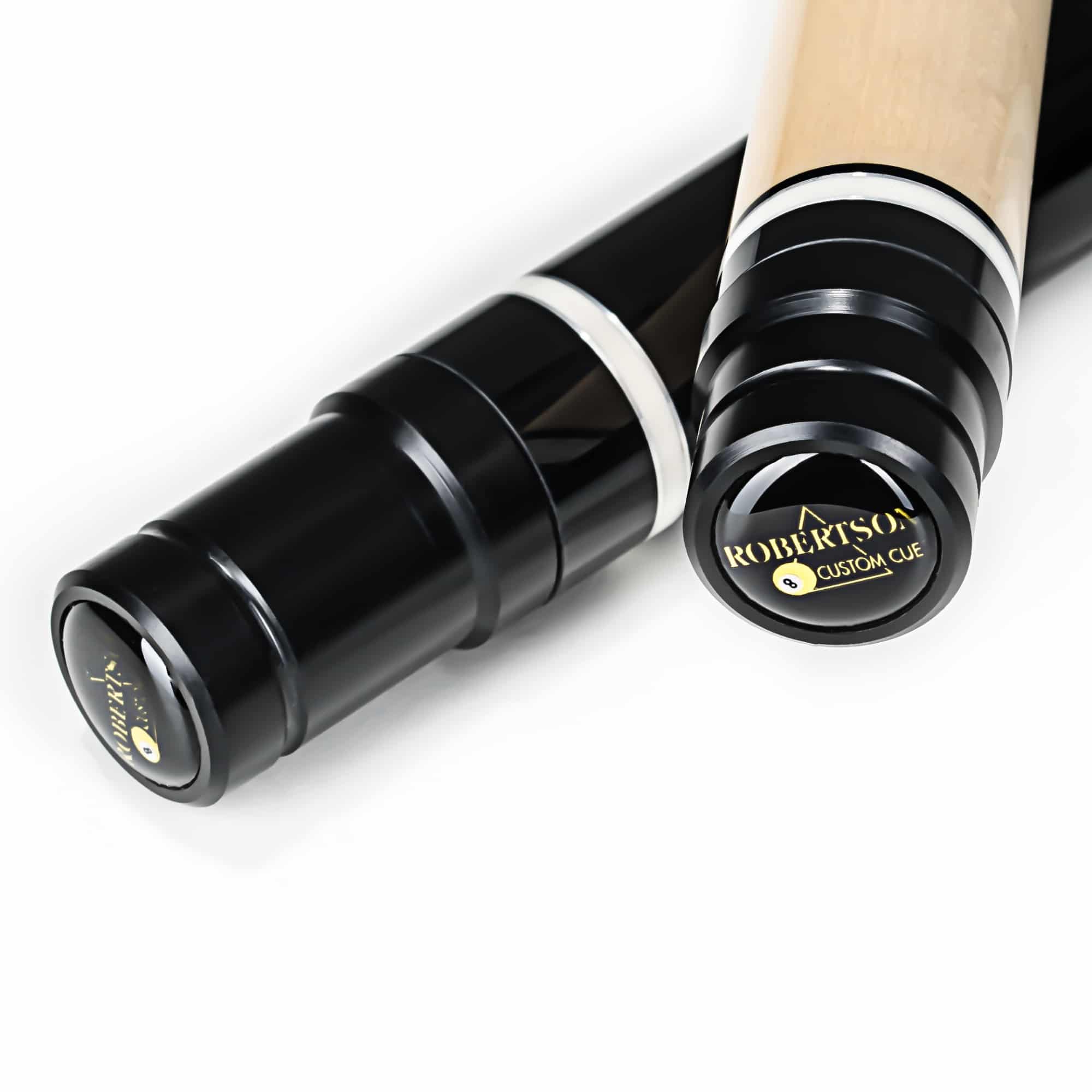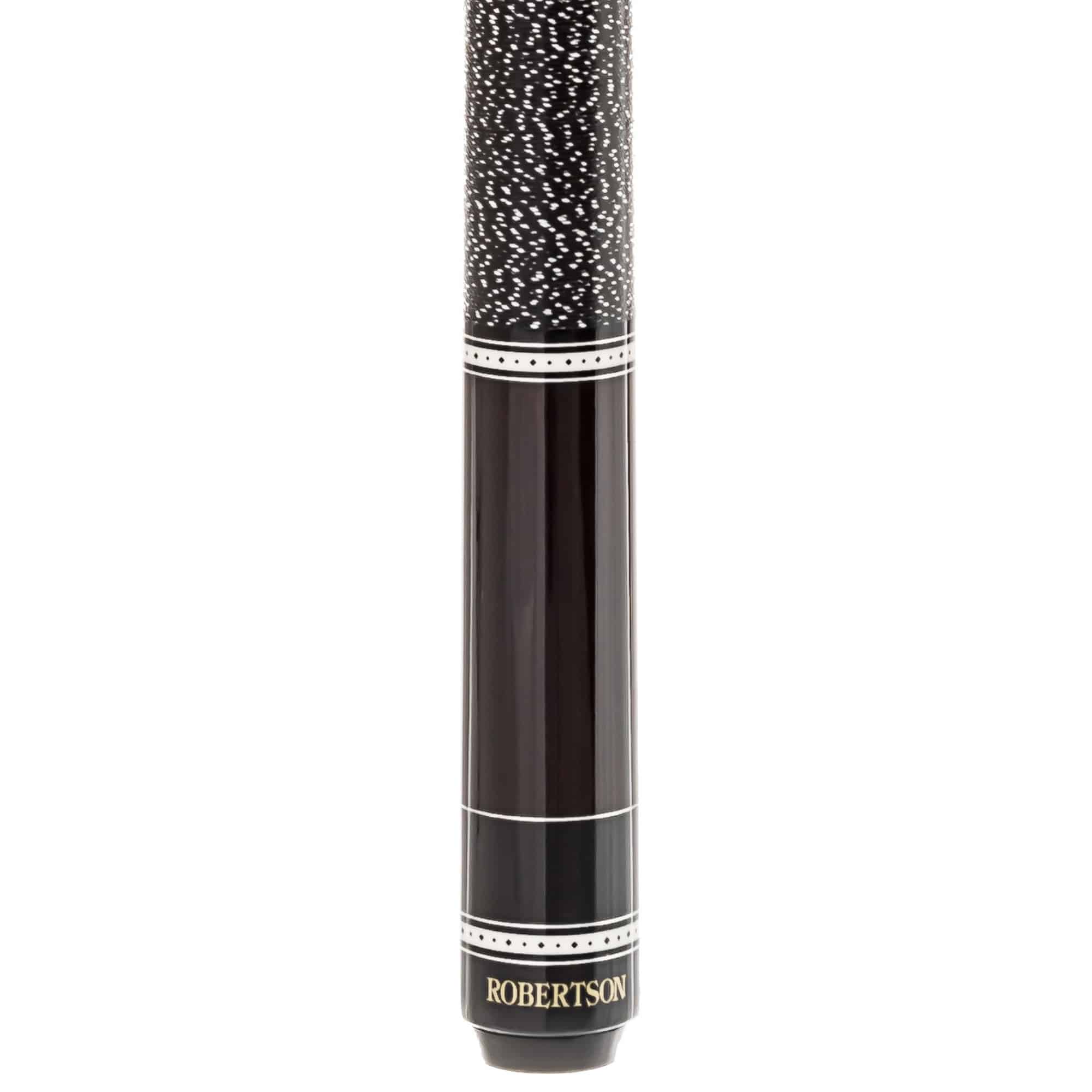 Neben den Ebenholzfarbigen Spitzen oberhalb vom Griff bestechen die auffälligen weiß-schwarzen Zierringe im Unterteil sowie passend dazu am schwarzen Joint. Verbunden wird das Oberteil durch einen sicheren 3/8-6 Quick Lock Steel-Gewinde. Neben dem optischen Highlight garantiert der Robertson Queue auch Top-Spielqualität und erfüllt alle Voraussetzungen für erfolgreiches Spielen auf höchstem Niveau. Ausgeliefert wird jeder Queue mit einem Original Robertson Gewindeschutz.