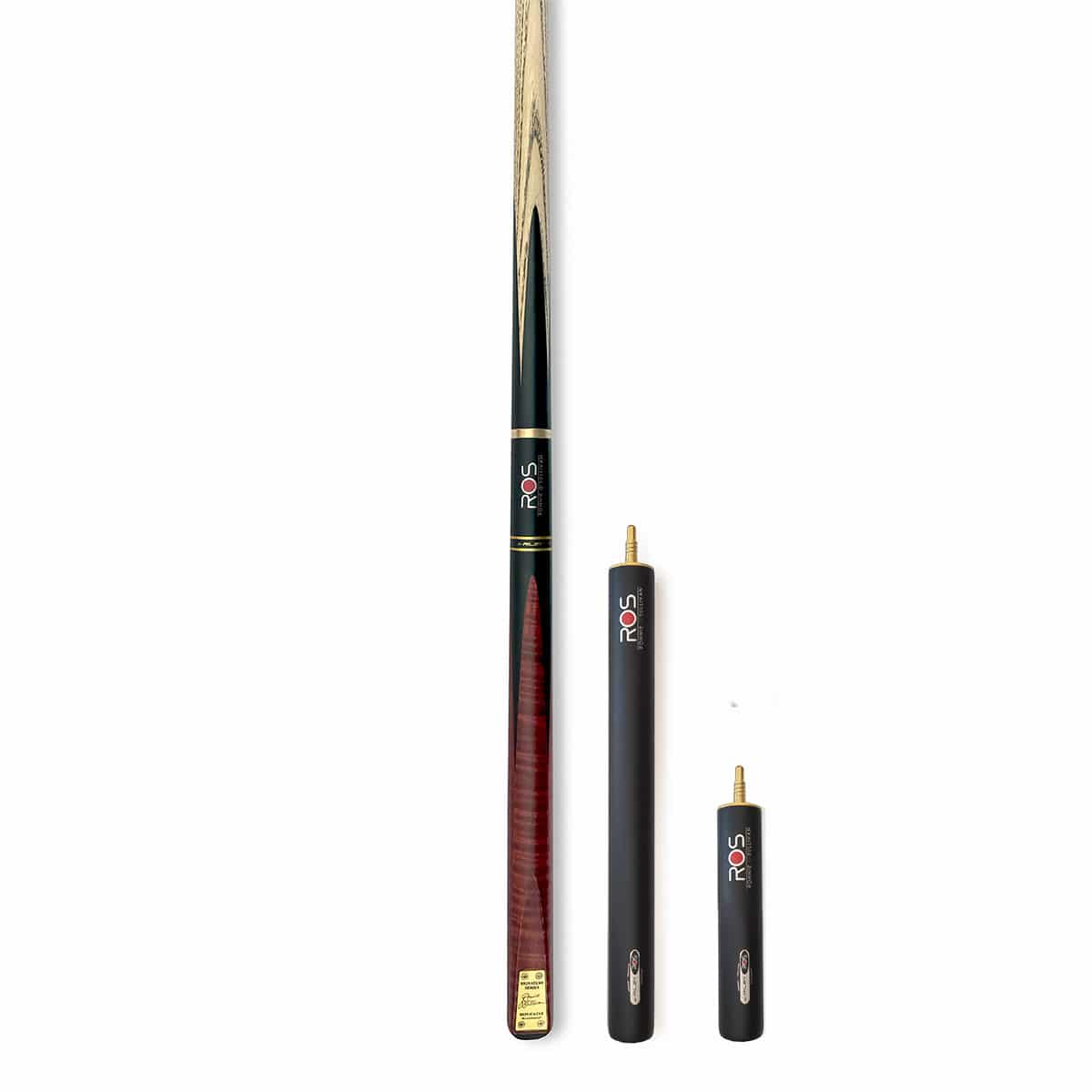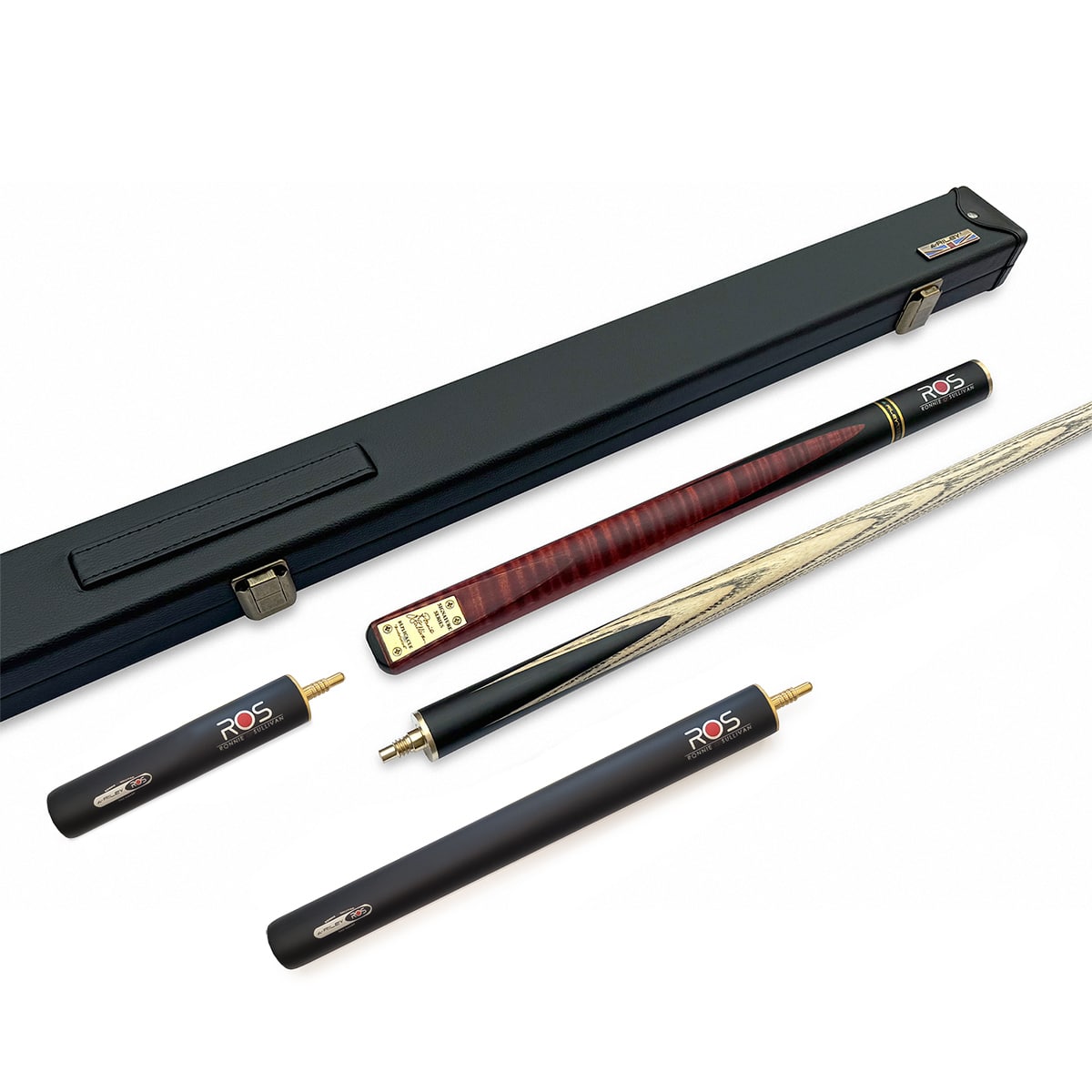 Das Snooker Highlight von der englischen Traditionsmarke Riley. Ein Queue, mitentwickelt von dem legendären Snooker Weltmeister Ronnie O’Sullivan. Das neue Modell RS-3 lässt selbst bei Profispielern keine Wünsche offen. Das Oberteil hat im Vergleich zum Unterteil eine sog. 3/4 Teilung und ist mit Länge von 105 cm deutlich länger als das 42 cm lange Unterteil. Diese ermöglicht beim Anvisieren eine längere Gleitphase und wird von vielen Profis deswegen bevorzugt. Das Gewinde besteht aus einem hochwertigen Zip-Lock Schnellgewinde aus Messing (Hand-Made by Riley) auch das Unterteil ist sehr hochwertig verarbeitet. Besonders schön ist die Design-Kombination des edel gebeizten dunklem Curley Maple Dekor in Verbindung mit ebenholzfarbigen Splices. Am But-Cap ist ein Messingplättchen mit der Originalsignatur von O’Sullivan eingearbeitet. Das Oberteil, das aus selektiertem nordamerikanischem Eschenholz besteht, ist mit einem 9,5 mm Elk Master Klebeleder versehen, das der selbst am liebsten spielt. Im Set sind zwei Verlängerungen (15 cm und 30 cm) inklusive. Der edle, mit PU überzogen 110 cm lange Koffer hat zur Sicherheit drei Messing, eloxierte Verschlüsse sowie eine Verstärkung an den Ecken. Das 4-teilige Luxus Snooker Set im Luxus Koffer ist ein High-End Modell und verdient den Namen der Legende O‘ Sullivan.