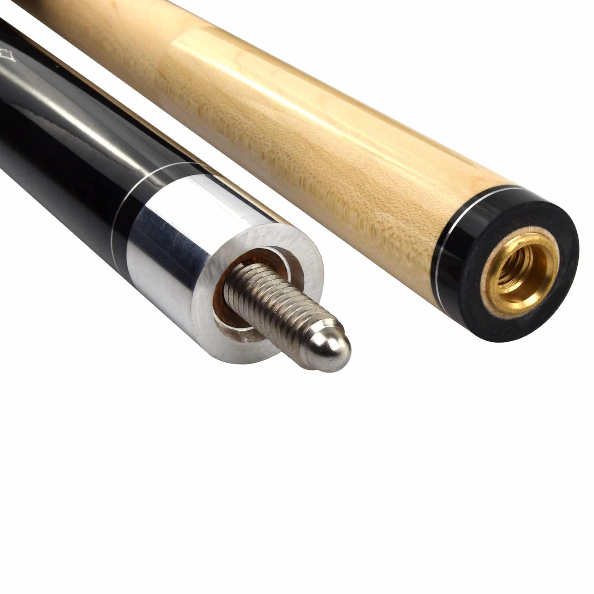 Das Ahornoberteil ist bei Tom Hardy mittelhart und daher für Hobby aber auch für einen vereinsaktiven Spieler bestens geeignet. Die Joint-Verbindung ist aus poliertem Stahl und verbindet das Oberteil mit einem präzisen Feingewinde und einem 13 mm Klebeleder.