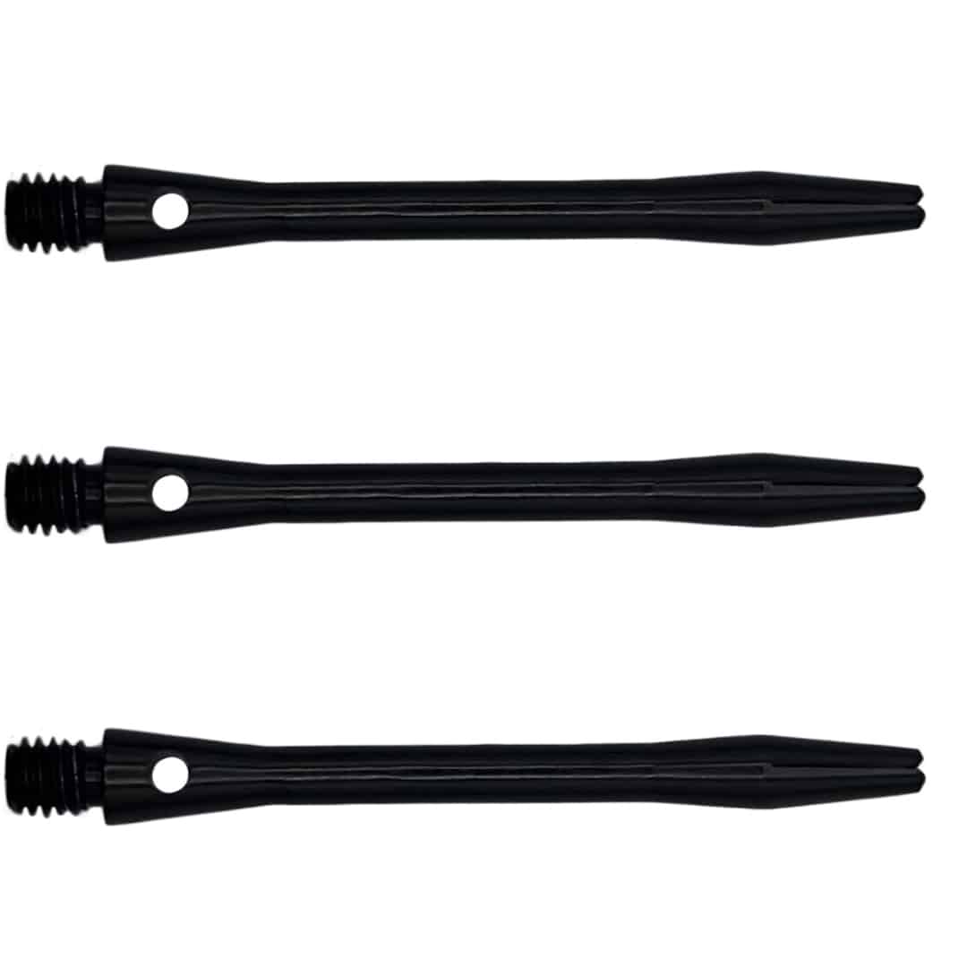 Shafts aus Aluminium gelten als die stabilsten Verbindungen zwischen Barrel und Flight. Selbst einem Treffer durch eine Metallspitze hält der Shaft stand. Auch das Gewinde ist robuster als bei Kunststoff oder Nylon-Shafts. Das bruchsichere Aluminium hat einen präzisen, engen Schlitz für die Flights. Passend für alle Formen und alle gängigen Flight-Stärken von 75 bis 125 Mic. Der Shaft ist mit dem Standard 2BA-Kleingewinde