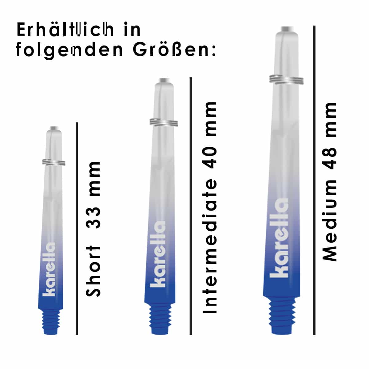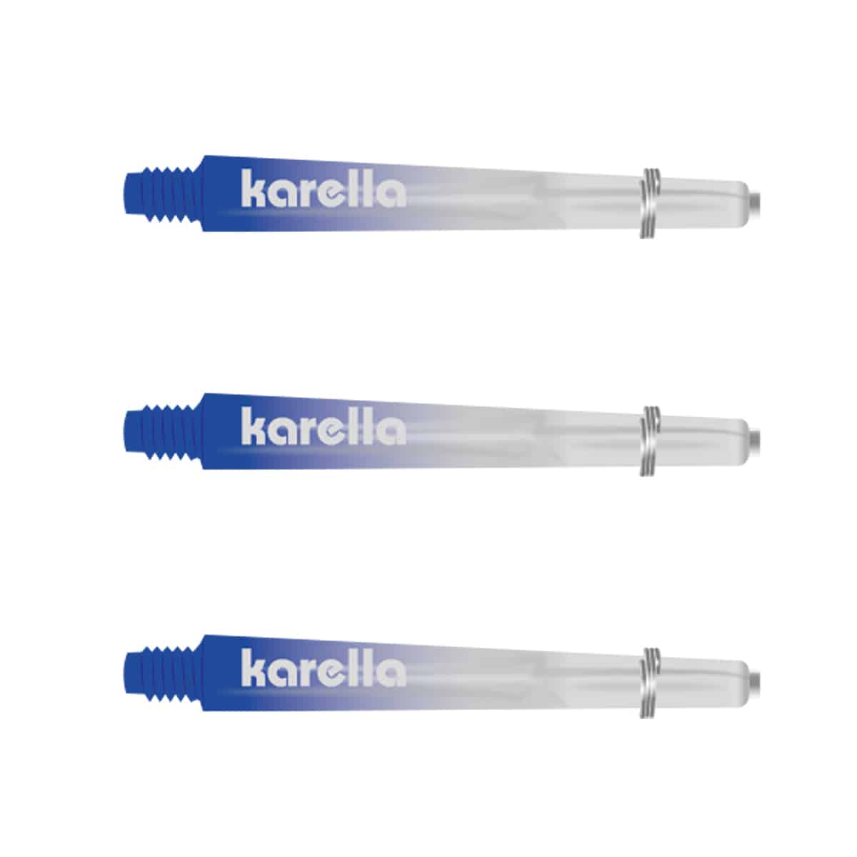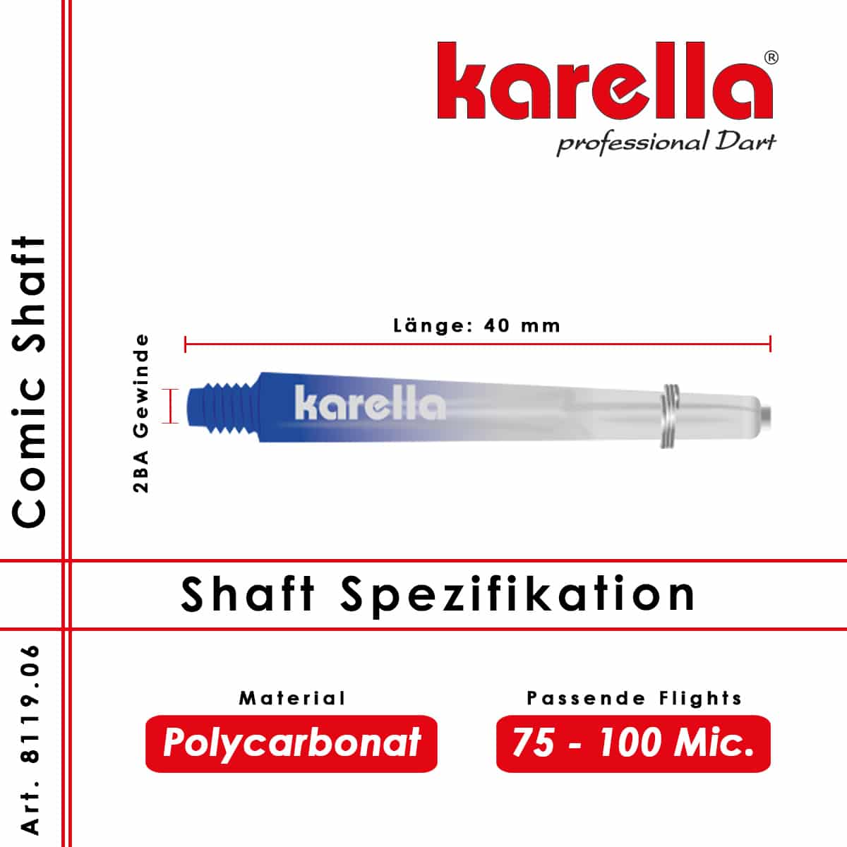 Aus einer speziellen Polycarbonat/Kunststoffmischung werden die Comic Shafts aus dem Hause Karella produziert. Sie sind etwas leichter als aus Aluminium und elastischer und sorgen für exzellente Flugeigenschaften. Man muss jedoch wissen, dass Shafts Verschleißmaterial sind und beim herunterfallen am Gewinde brechen können. Ebenso kann der Treffer einer Metallspitze sie beschädigen. Daher empfiehlt es sich immer ein paar Shafts in Reserve zu haben. Die Karella Comic Shafts mit dem gängigen 2BA-Kleingewinde sitzen präzise perfekt im Barrel. Sie sind mit einem zusätzlichen Edelstahl Schutzring am Schlitzende ausgestattet der den Shaft umschließt und zusätzlich für sicheren Halt aller gängigen Stärken der Flights sorgt. Ein stylischer Farbverlauf ins Durchsichtige bringt bei diesen Shafts Farbe ins Spiel.