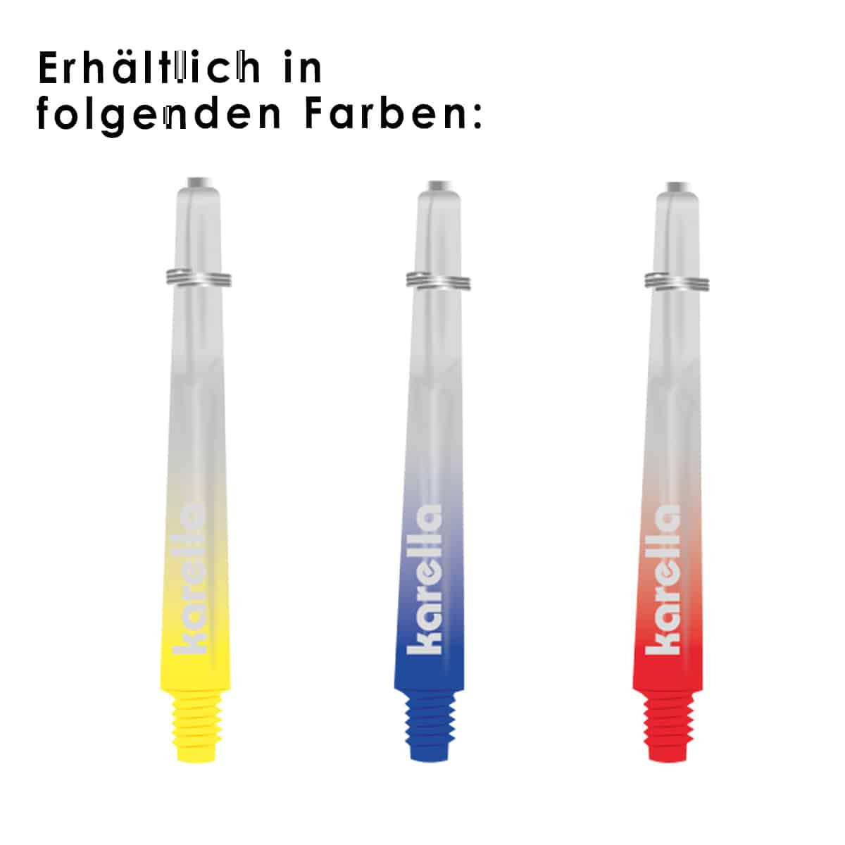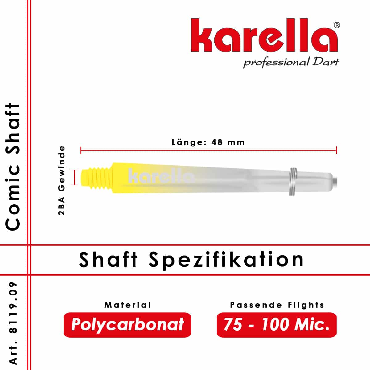 Aus einer speziellen Polycarbonat/Kunststoffmischung werden die Comic Shafts aus dem Hause Karella produziert. Sie sind etwas leichter als aus Aluminium und elastischer und sorgen für exzellente Flugeigenschaften. Man muss jedoch wissen, dass Shafts Verschleißmaterial sind und beim herunterfallen am Gewinde brechen können. Ebenso kann der Treffer einer Metallspitze sie beschädigen. Daher empfiehlt es sich immer ein paar Shafts in Reserve zu haben. Die Karella Comic Shafts mit dem gängigen 2BA-Kleingewinde sitzen präzise perfekt im Barrel. Sie sind mit einem zusätzlichen Edelstahl Schutzring am Schlitzende ausgestattet der den Shaft umschließt und zusätzlich für sicheren Halt aller gängigen Stärken der Flights sorgt. Ein stylischer Farbverlauf ins Durchsichtige bringt bei diesen Shafts Farbe ins Spiel.