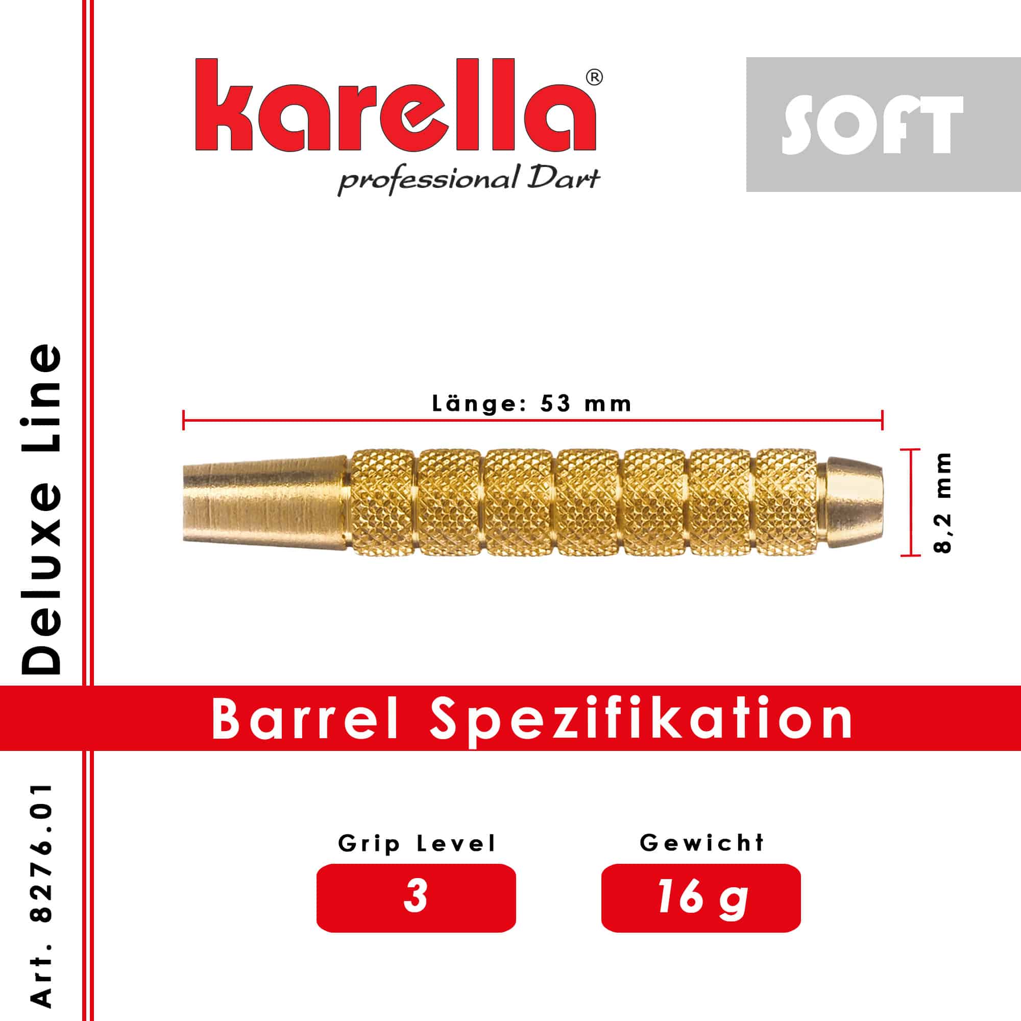 Die neuen Karella Deluxe Barrels verfügen über ein unschlagbares Preis-Leistungs-Verhältnis. Die auffallend attraktiven Barrels haben unterschiedliche Formen, Griparten und Beschichtungen. Dank der perfekten Gewichtsverteilung und präzisen Verarbeitung garantieren die Barrels ein hervorragendes Handling für jeden Wurfstil. Die Barrels sind jeweils in Soft und Steel erhältlich. Die Preise verstehen sich je Set (3 St.). Die Barrels sind auf Anfrage auch lose erhältlich. Der DLS-1 ist messingbeschichtet und hat durch seine Riffelungen viel Grip.