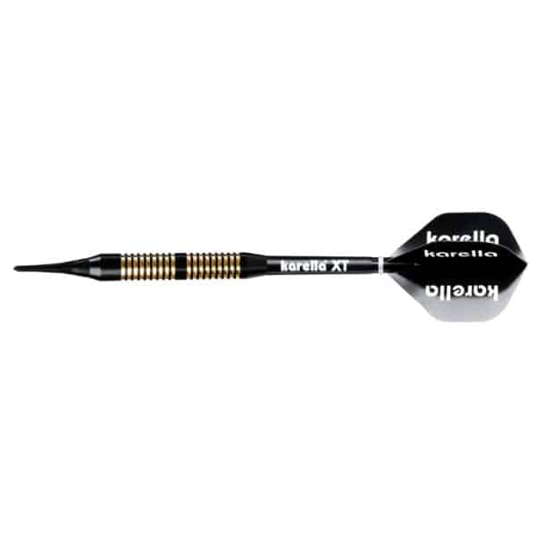 Die Karella XT-Serie als Steel- und Softdart verbindet Design und Qualität bei einem unschlagbaren Preis-Leistungs-Verhältnis. Der Karella XT-6 Soft sorgt mit seiner eleganten Erscheinung für Aufsehen am Board. Der hochwertig beschichtete schwarz- und goldfarbene Messignbarrel bietet dem Spieler einen einfachen, aber effektiven Grip. Dank der ausgeprägten Ringstruktur liegt der Dart sehr gut in der Hand. Kombiniert mit den farblich passenden 100 Mic. starken XT-Profi Flights sowie den schwarzen Karella XT-Schäften (Medium) stellt der XT-6 nicht nur optisch ein absolutes Highlight dar. Verpackt ist das Set in einem schönen Blister inklusive Darthalter. Karella XT Serie – Ideal für Einsteiger und Hobbyspieler.