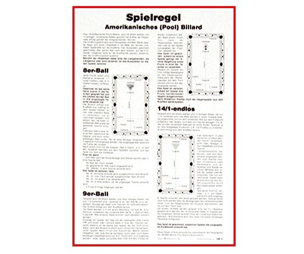 Poster aus Karton mit Aufhängung. Einfache Zusammenfassung der aktuellen Poolbillard-Spielregeln.AbmessungenAbmessungen: ca. 34 x 49 cm