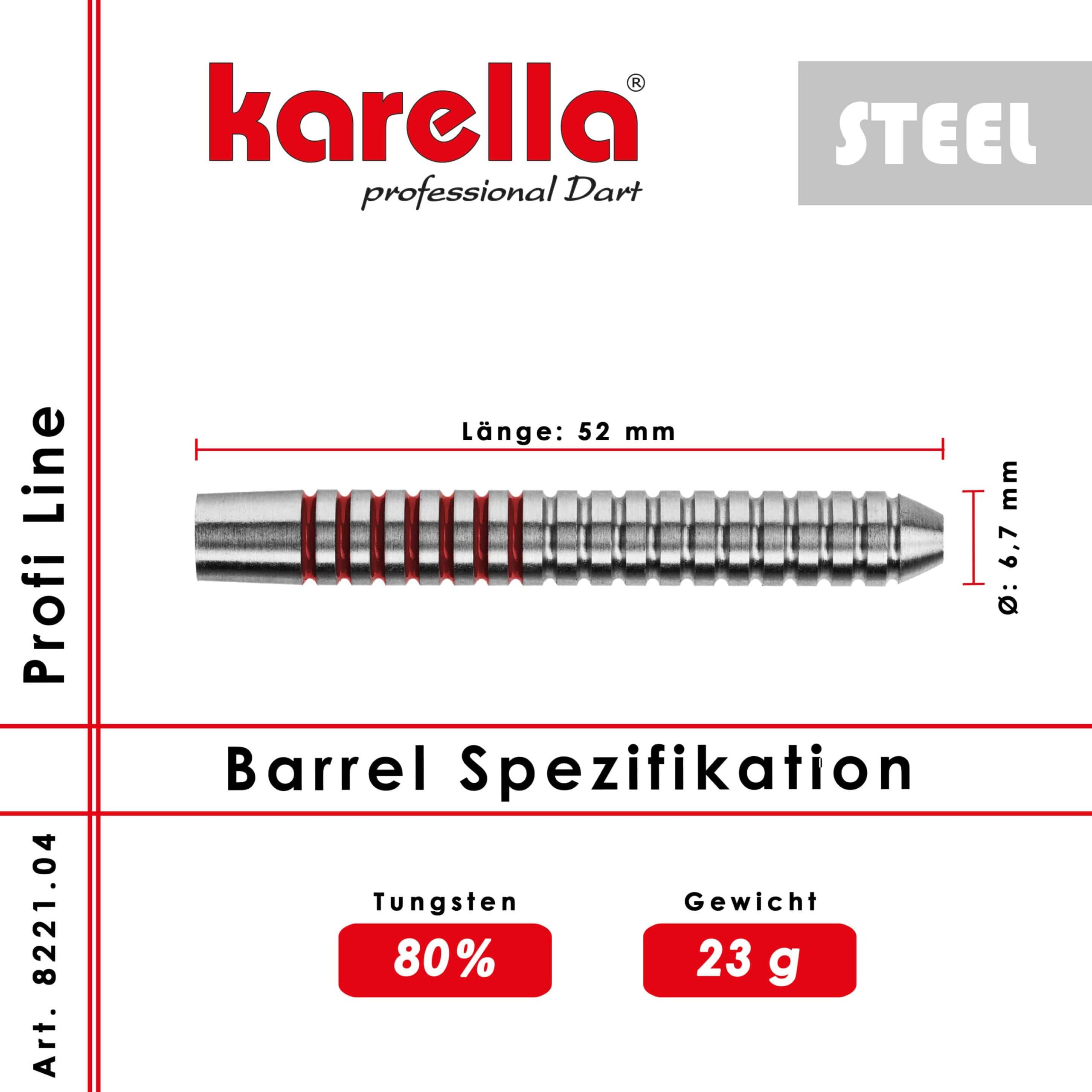 Das Herzstück eines jeden Dartpfeils ist der Barrel! Mit der Profi Line präsentiert Karella hochwertige Tungsten Barrels, die in einem aufwändigen, mehrstufigen Prozess hergestellt werden, bis die gewohnte Karella Qualität erreicht ist. Die verschiedensten Längen, Durchmesser, Formen und Veredelungen bieten für jeden Dartspieler den idealen individuellen Barrel. Bei dem Modell PL-04 sorgt die gleichmäßige Ringstruktur für den idealen Grip. Die Zylinderform sorgt zudem für eine optimale, gleichmäßige Gewichtsverteilung.