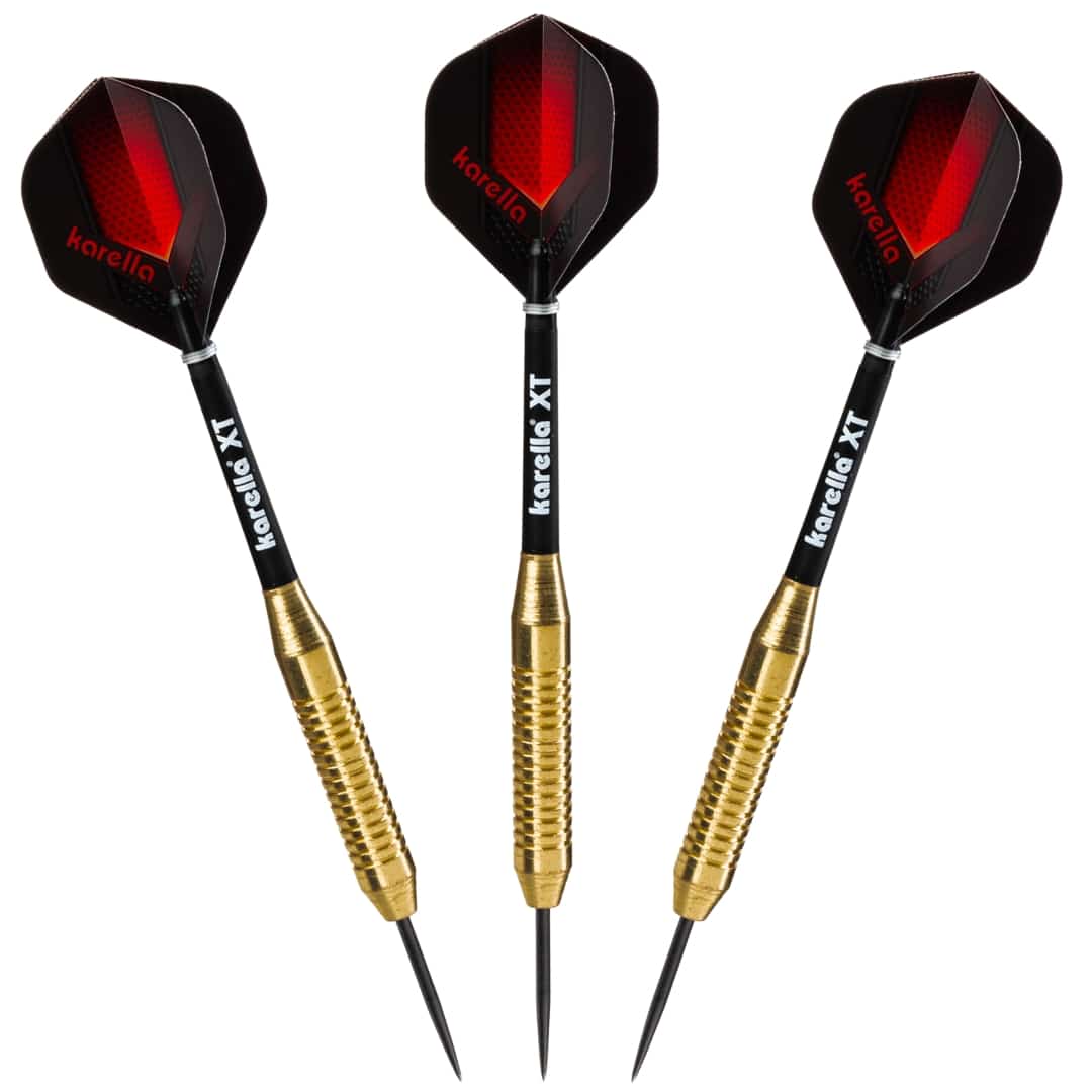 Die Karella XT-Serie als Steel- und Softdart verbindet Design und Qualität bei einem unschlagbaren Preis-Leistungs-Verhältnis. Der XT-1 Steel ist das ideale Dartset für Einsteiger, mit perfekter Gewichtsverteilung. Die klassische Zylinderform des messingfarbenen Barrels weißt eine leichte Ringstruktur auf und bietet ausreichend Orientierung für die Finger. Dadurch sind auch für Freizeitspieler hohe Scores möglich. Der Dart kommt mit Profi Karella XT-Schäften (Medium) und 100 Mic. starken XT-Profi Flights. Verpackt ist das Set in einem schönen Blister inklusive Darthalter. Karella XT Serie – Ideal für Einsteiger und Hobbyspieler.