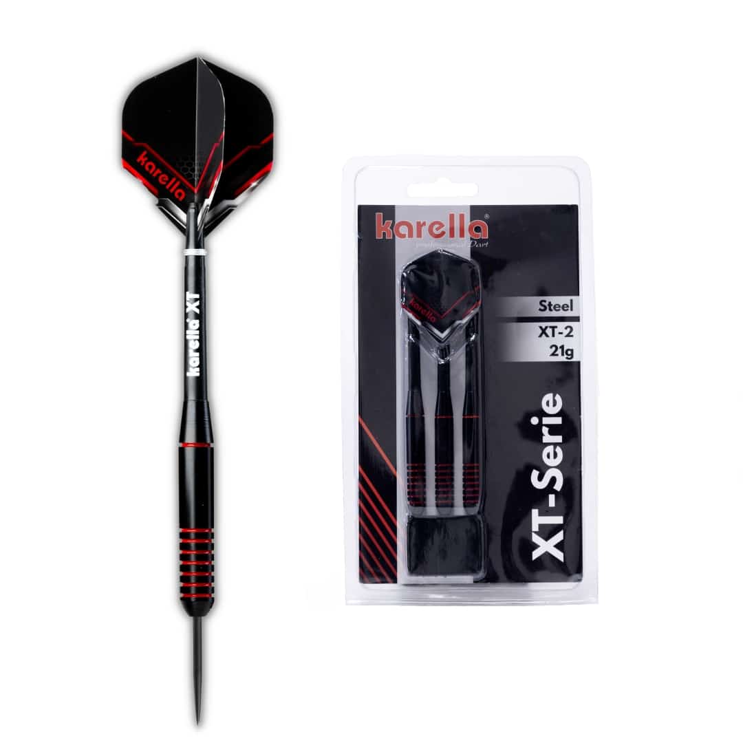 Die Karella XT-Serie als Steel- und Softdart verbindet Design und Qualität bei einem unschlagbaren Preis-Leistungs-Verhältnis. Der XT-2 Steel ist ein echter Hingucker am Dartboard! Der schwarz beschichtete, gerade Barrel des XT-2 Steel ist mit seinen rot gefärbten Griffrillen in den klassischen Karella Farben gehalten. Der perfekt ausbalancierte Dart liegt perfekt in der Hand und überzeugt durch erstklassige Flugeigenschaften. Kombiniert mit den farblich passenden 100 Mic. starken XT-Profi Flights sowie den schwarzen Karella XT-Schäften (Medium) stellt der XT-2 Steel nicht nur optisch ein absolutes Highlight dar. Verpackt ist das Set in einem schönen Blister inklusive Darthalter. Karella XT Serie – Ideal für Einsteiger und Hobbyspieler.