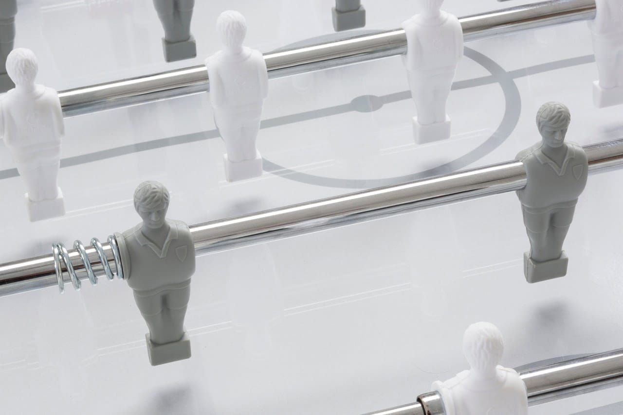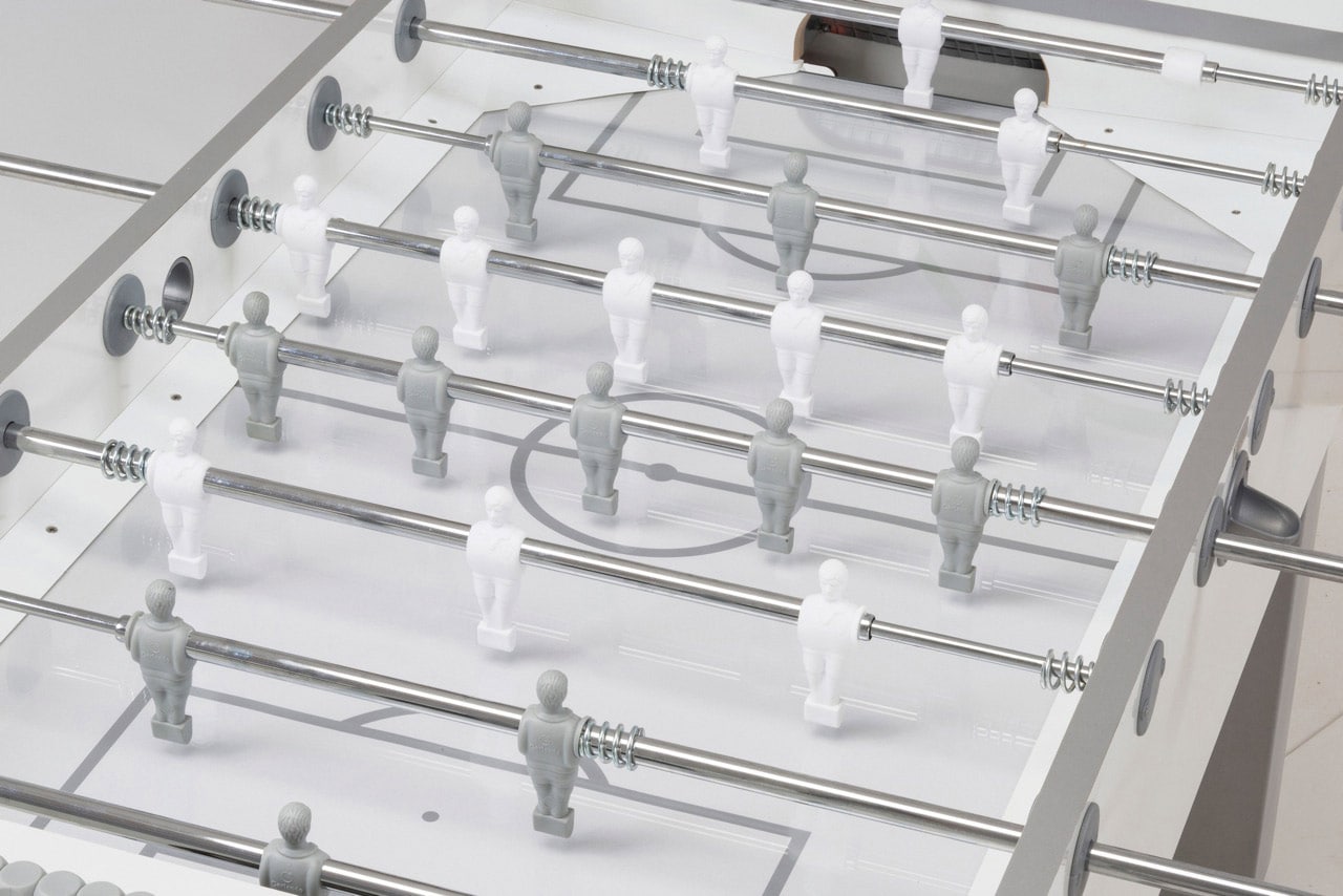 In der professionellen Ausführung (PR) gleiten die 16 mm starken Stangen in leichtgängigen Doppelkugellagern. Die kindersichere Version (SA) ist mit Teleskopstangen ausgestattet. Hierbei ragen die Stangenenden auf der gegenüberliegenden Seite nicht heraus. Die genormten und bruchsicheren Figuren sind bereits ab Werk auf die Spielstangen aufgespritzt. Metallfedern sorgen für die optimal Dämpfung an den Banden. Außerdem werden die Handgelenke durch die Kugellager geschont.