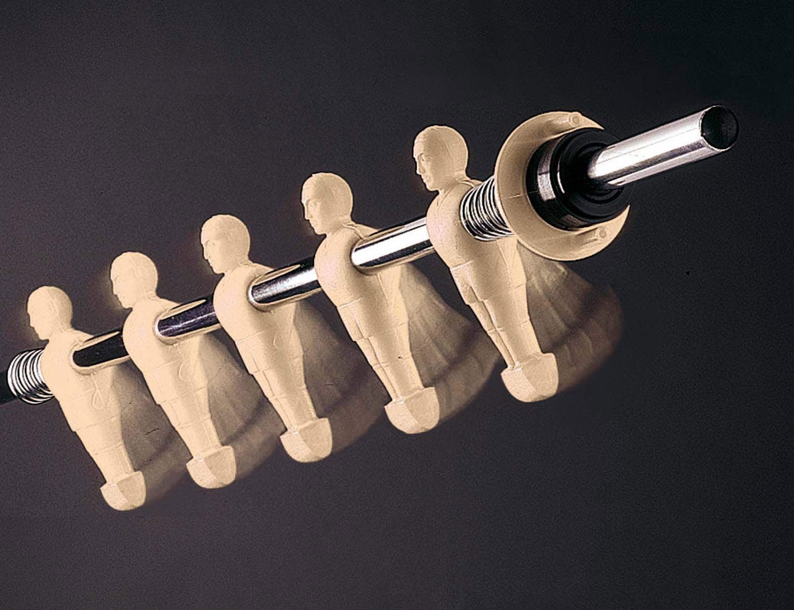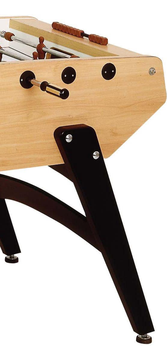 Filigranes Design verbunden mit hochwertiger Verarbeitung ergeben diesen Tischkicker mit 30 mm starkem Mehrschicht-Korpus, dessen Oberfläche über eine robuste Laminatbeschichtung verfügt. Das unempfindliche Birnbaum-Dekor ist leicht zu reinigen. Der ideale Tischkicker für den Innenbereich, geeignet für Jugendräume/Schulen und Vereinsheime. Der Kicker besitzt stabile 16 mm verchromte Spielstangen mit Holzgriffen, die in Kugellagern laufen. Die nahezu unzerbrechlichen Spieler sind fest auf die Stangen gegossen, sowie zur Korpuswand hin mit Distanzfedern gedämpft.