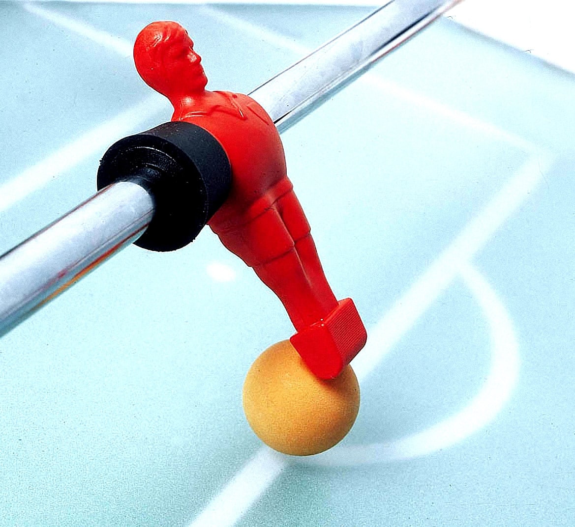 Farbe: schwarz mit dem Logo ITSF und der offiziellen Plakette mit Seriennummer und Training-Registrierungsbescheinigung. Die viereckigen, höhenverstellbare Metallbeine (9 x 9 cm) mit kratzfester Pulverbeschichtung verleihen dem Tisch eine kaum zu überbietende Standfestigkeit und können zur Erzielung einer vollkommen waagerechten Ebene des Spielfeldes exakt justiert werden. Der Pro Champion ist mit äußerst stabilen, rostschutzsicher verchromten Standardstangen aus Stahl ausgestattet, auf welchen die nahezu unverwüstlichen roten und blauen Spielerfiguren aufgegossen und zur Korpuswand hin mit innovativen Gummipuffern stoßgedämpft sind. Stangen-Durchmesser 16 mm. Die Torwartstange ist mit Abstandsgummi ausgestattet, die den Spieler im Aktionsbereich des Tores hält. Kugellager der Turnierqualität garantieren eine hohe Leichtgängigkeit der Stangen, hohe Spielgeschwindigkeit und höchsten Spielkomfort mit geringen Handgelenksbelastungen für die Spieler. Der Torwart ist 360° rotierend. Das Spielfeld besteht aus gehärtetem, sandgestrahlten Glas, grün mit weißen Linien. Integrierte Ballentnahmen an den Stirnseiten. Im Lieferumfang sind 10 weiße Nylon-Kickerbälle, Ø 34 mm, Gewicht 22 gr. enthalten.