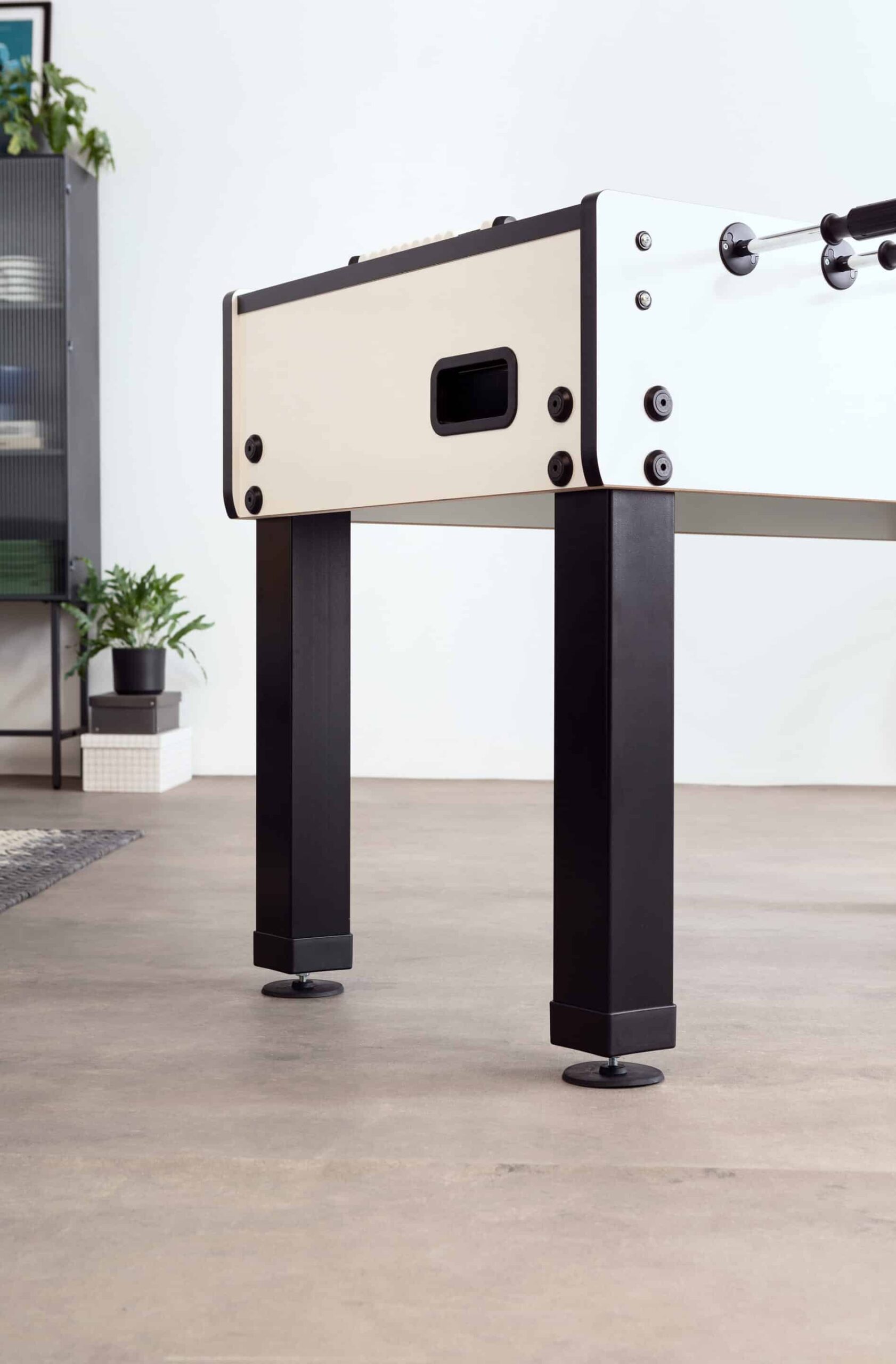 Der melaminbeschichtete Korpus besteht aus einer 25 mm starken Wandung aus MDF. Zusätzlich ist der Korpus an allen Ecken und Außenkanten abgerundet. Zur schnellen Ballentnahme ist auf jeder Spielerseite ein Ballrücklauf integriert.