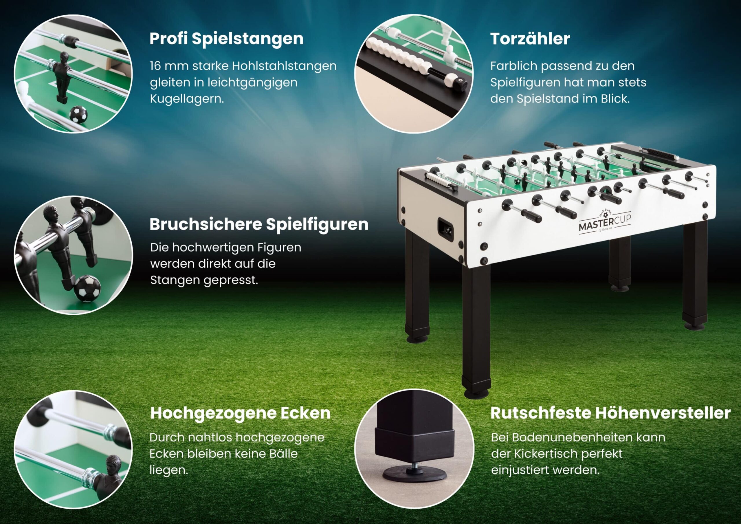 Garlando ist eine Marke für Tischfußball, Tischkicker und Spieltische. Die Marke ist bekannt für robuste Bauweise, langlebige Materialien und zuverlässige Spieltische, die für Freizeit, Vereine und gewerbliche Einrichtungen geeignet sind. Garlando-Produkte zeichnen sich durch präzise Kugelführung, stabile Stangen und langlebige Spielfiguren aus.
