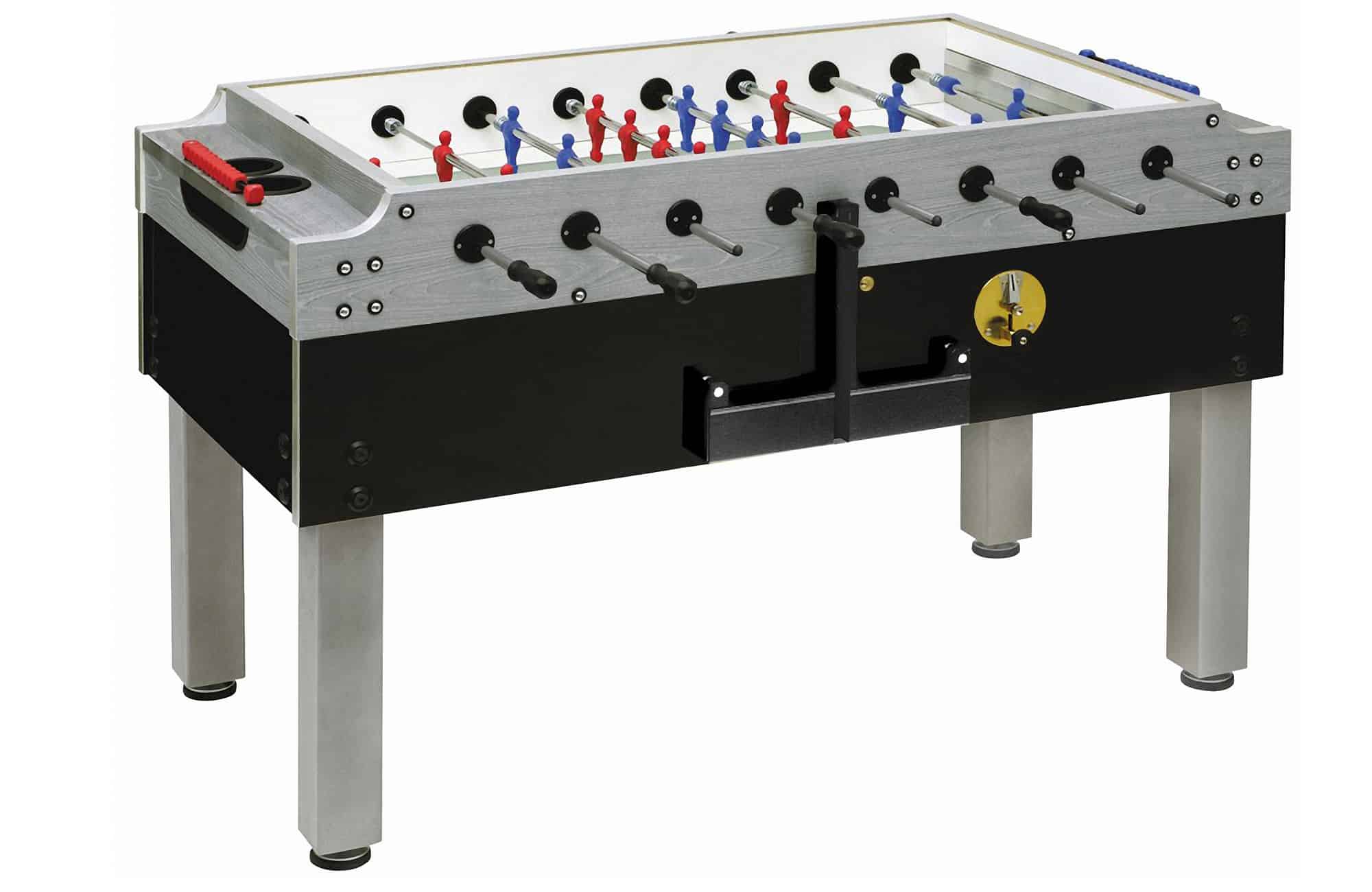 In der professionellen Ausführung (PR) gleiten die 16 mm starken Stangen in leichtgängigen Doppelkugellagern. Die kindersichere Version (SA) ist mit Teleskopstangen ausgestattet. Hierbei ragen die Stangenenden auf der gegenüberliegenden Seite nicht heraus. Die genormten und bruchsicheren Figuren sind bereits ab Werk auf die Spielstangen aufgespritzt. Metallfedern sorgen für die optimal Dämpfung an den Banden. Außerdem werden die Handgelenke durch die Kugellager geschont.