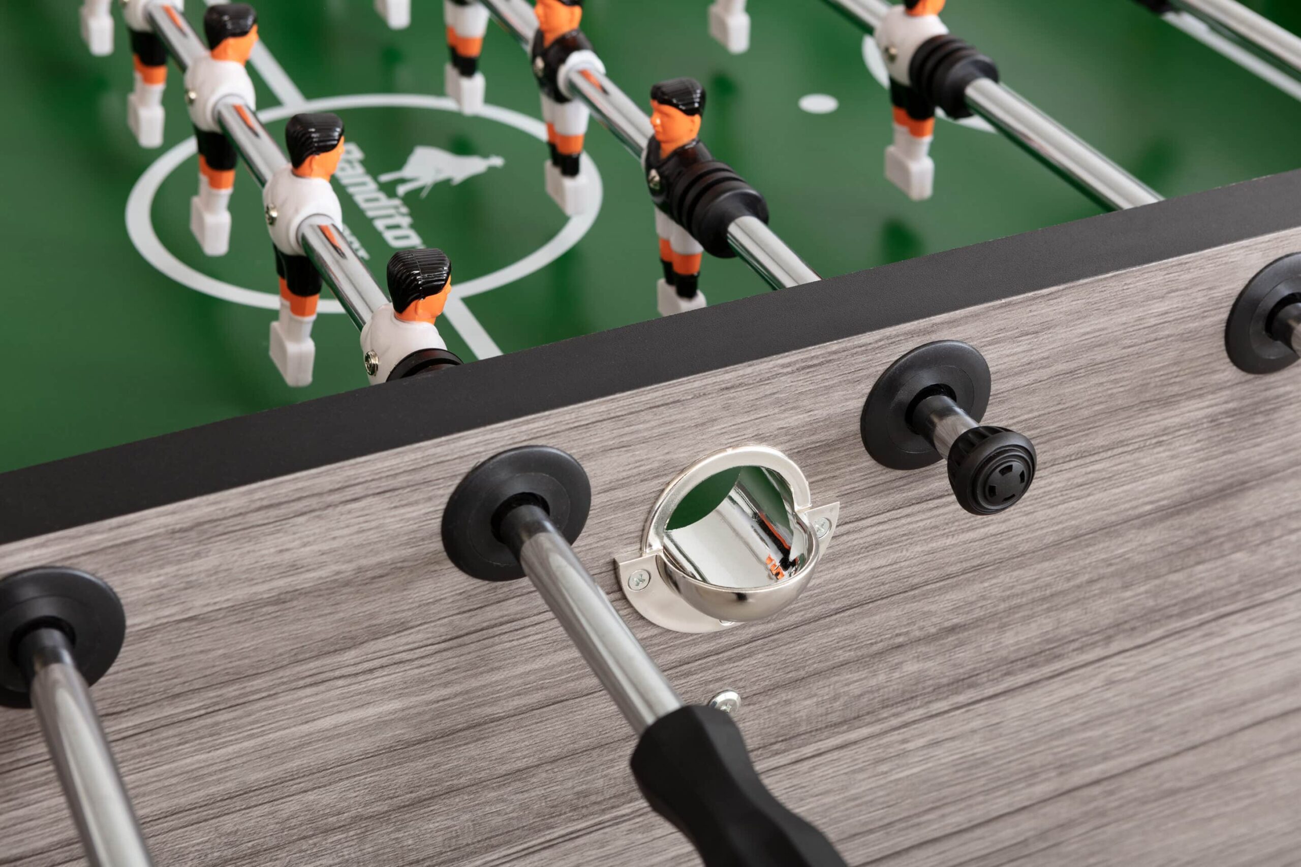 Die robusten Spielfiguren sind einzeln geschraubt und können so schnell ausgetauscht werden. Weiche Gummipuffer sorgen für die optimale Dämpfung an den Bandenseiten. Das grüne Turnierspielfeld mit weißen Spielfeldlinien ist durch eine Spezialbeschichtung besonders kratz und schlagfest (12 mm Spielfeldstärke). Nahtlos hochgezogene Spielfeldecken sorgen für rasanten Spielfluss, weil keine Bälle dort liegenbleiben können. Zur schnellen Ballentnahme befindet sich an jeder Spielerseite ein Ballrücklauf. An beiden Stirnflächen sind Torzähler sowie Getränkehalter angebracht.