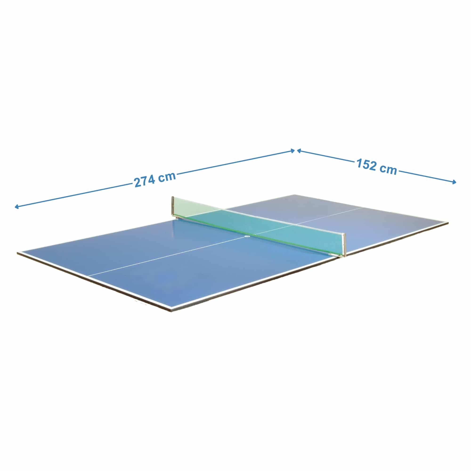 Einfach auflegen, das mitgelieferte Netz anbringen und schon kann es losgehen. Geeignet für Billardtische bis Größe 8 ft. Dadurch, dass die Tischtennisplatte (Auflage) ohne Untergestell ist, kann man sie auch auf allen anderen Tischen z. B. auf 2 Bierzelttischen auflegen. Das Maximalmaß für den Tisch (Untergestell) zum Auflegen der Platte: 274 × 152 cm. Nach dem Spielbetrieb können die zwei Plattenteile schnell und platzsparend hochkant verstaut werden.