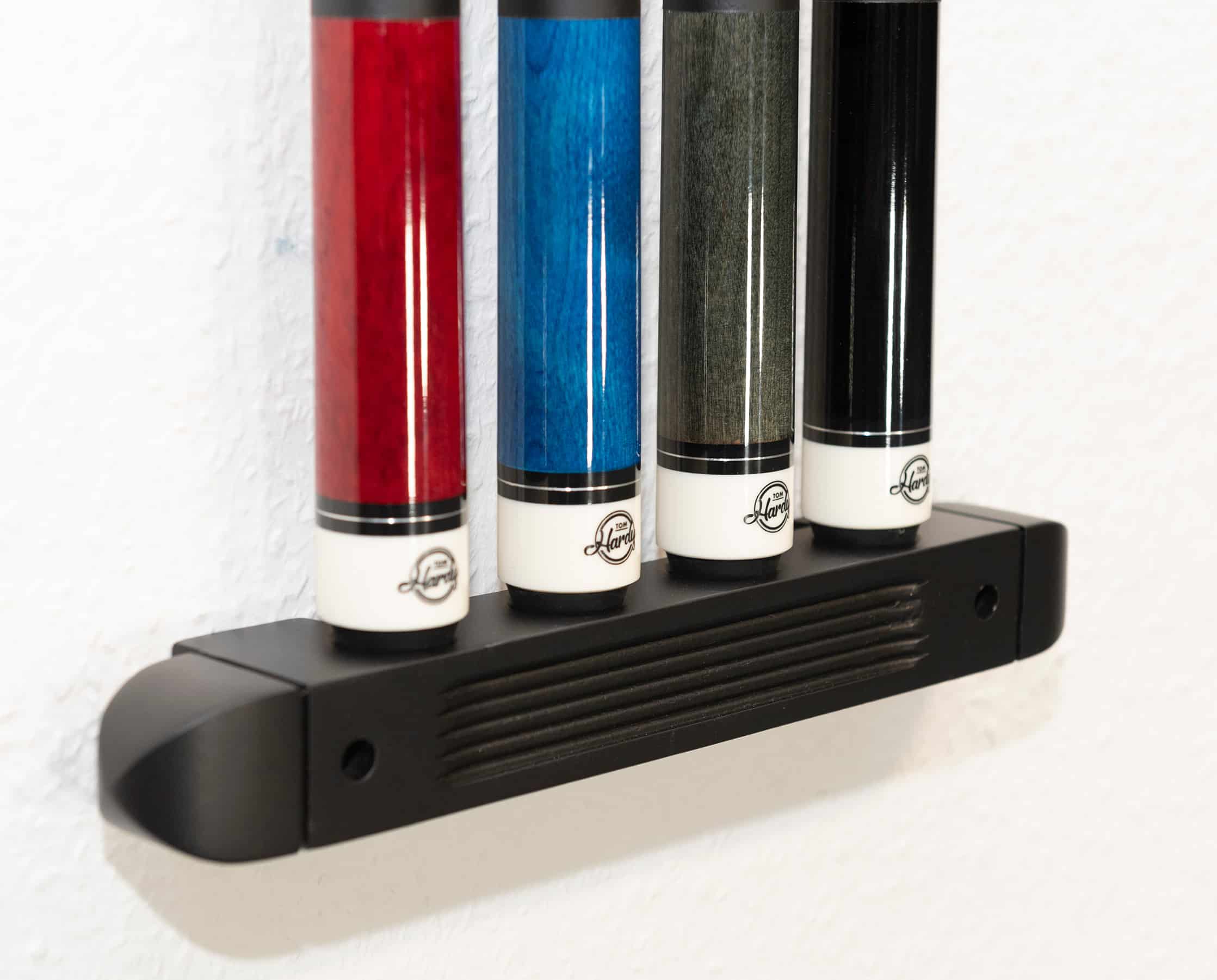 Hochwertiger zweiteiliger Billardqueue Wandhalter Modell Antik aus Rubberwood (biologischem Austauschholz). Das Wandhalter-Unterteil ist mit Mulden versehen, passend für den Gummipuffer am Queueende. Das Oberteil des Halters hat abgerundete PVC-Clips zum schonenden Eindrücken der Oberteile, erhältlich in braun und schwarz, mit jeweils 4-fach sowie 6-fach Einteilung. Abstand Wandhalter von Unterteil zum Oberteil, je nach Queuelänge 100–130 cm.