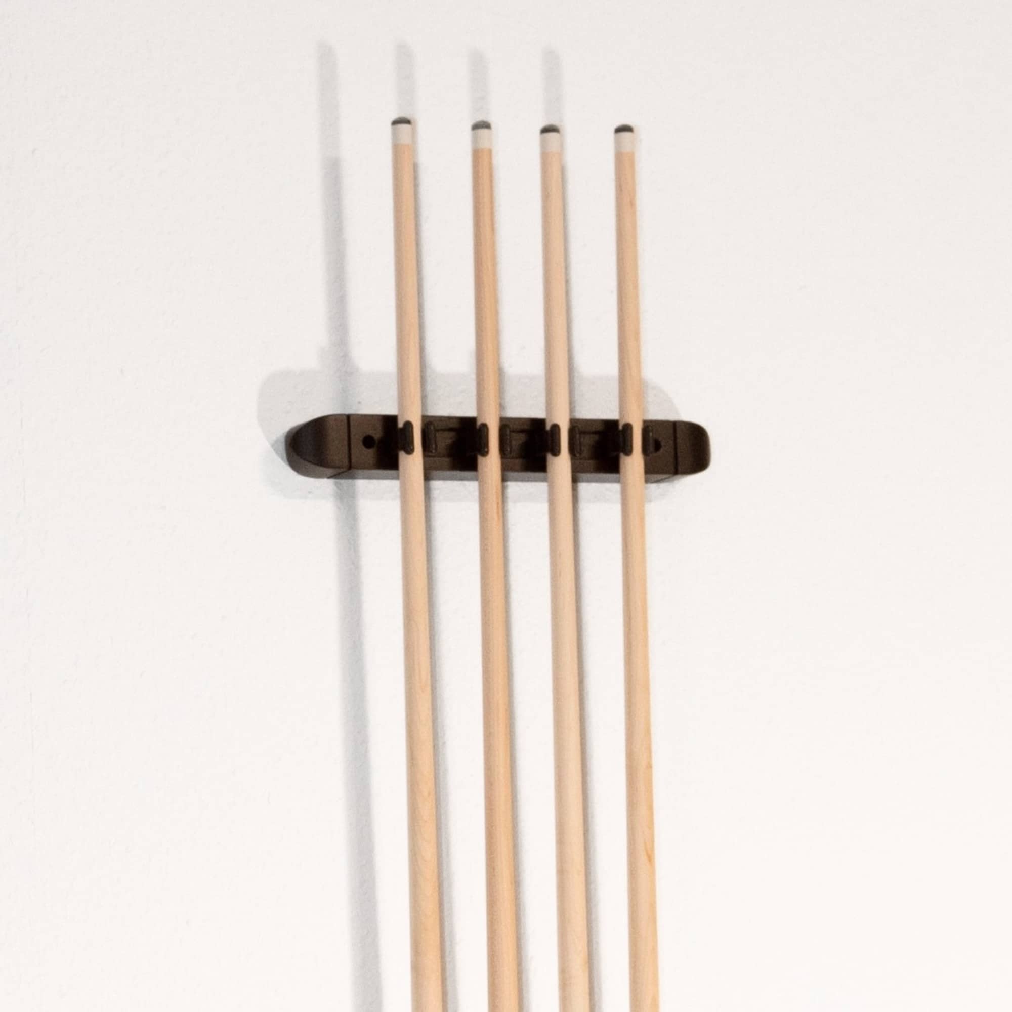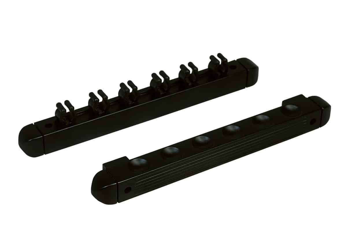 Hochwertiger zweiteiliger Billardqueue Wandhalter Modell Antik aus Rubberwood (biologischem Austauschholz). Das Wandhalter-Unterteil ist mit Mulden versehen, passend für den Gummipuffer am Queueende. Das Oberteil des Halters hat abgerundete PVC-Clips zum schonenden Eindrücken der Oberteile, erhältlich in braun und schwarz, mit jeweils 4-fach sowie 6-fach Einteilung. Abstand Wandhalter von Unterteil zum Oberteil, je nach Queuelänge 100–130 cm.